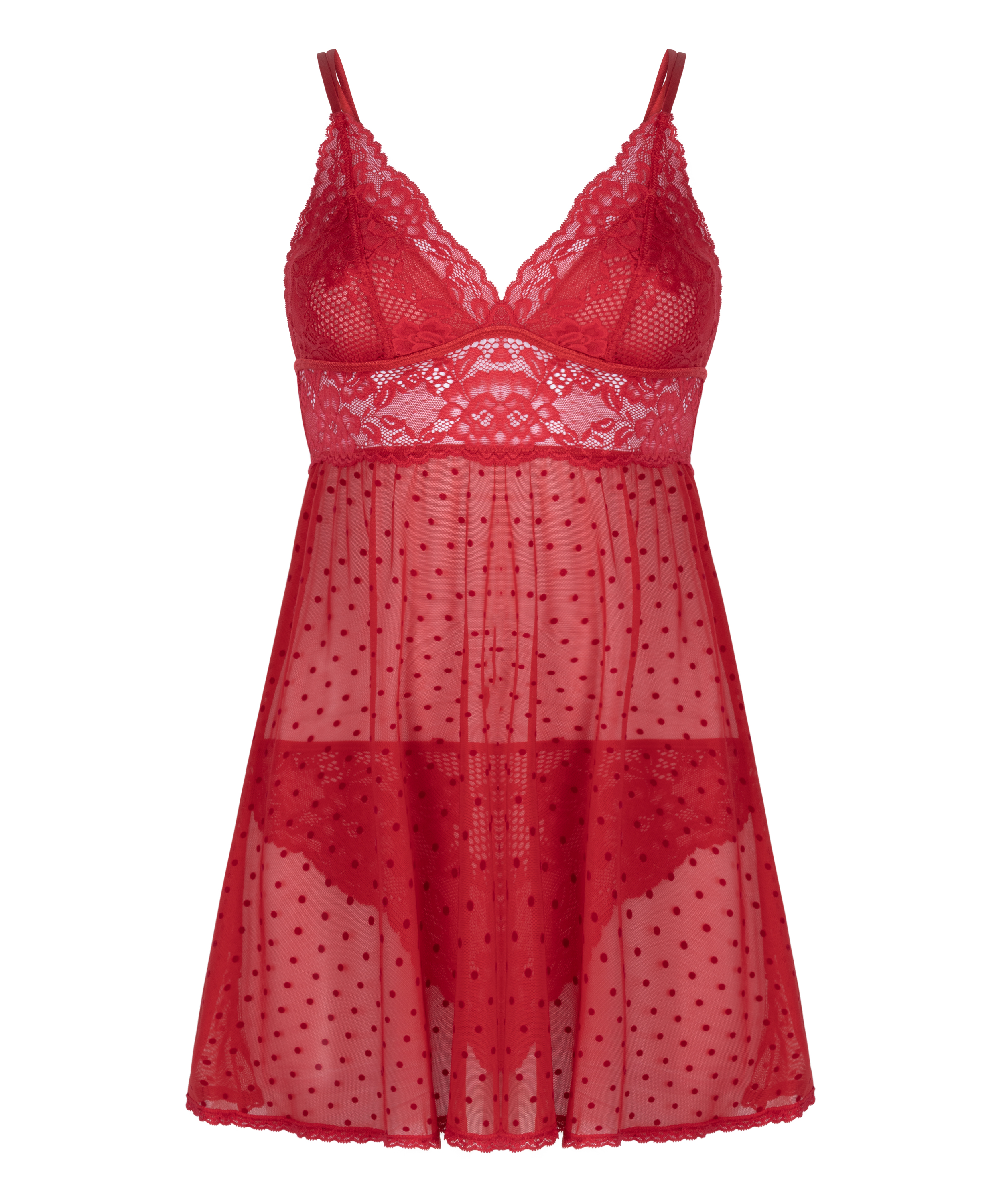 Voel je sexy in deze non-wired babydoll! De babydoll heeft kanten en mesh details, verstelbare bandjes en is afgewerkt met een stipjespatroon. De bijpassende slip is gemaakt van een mix van kant en mesh.