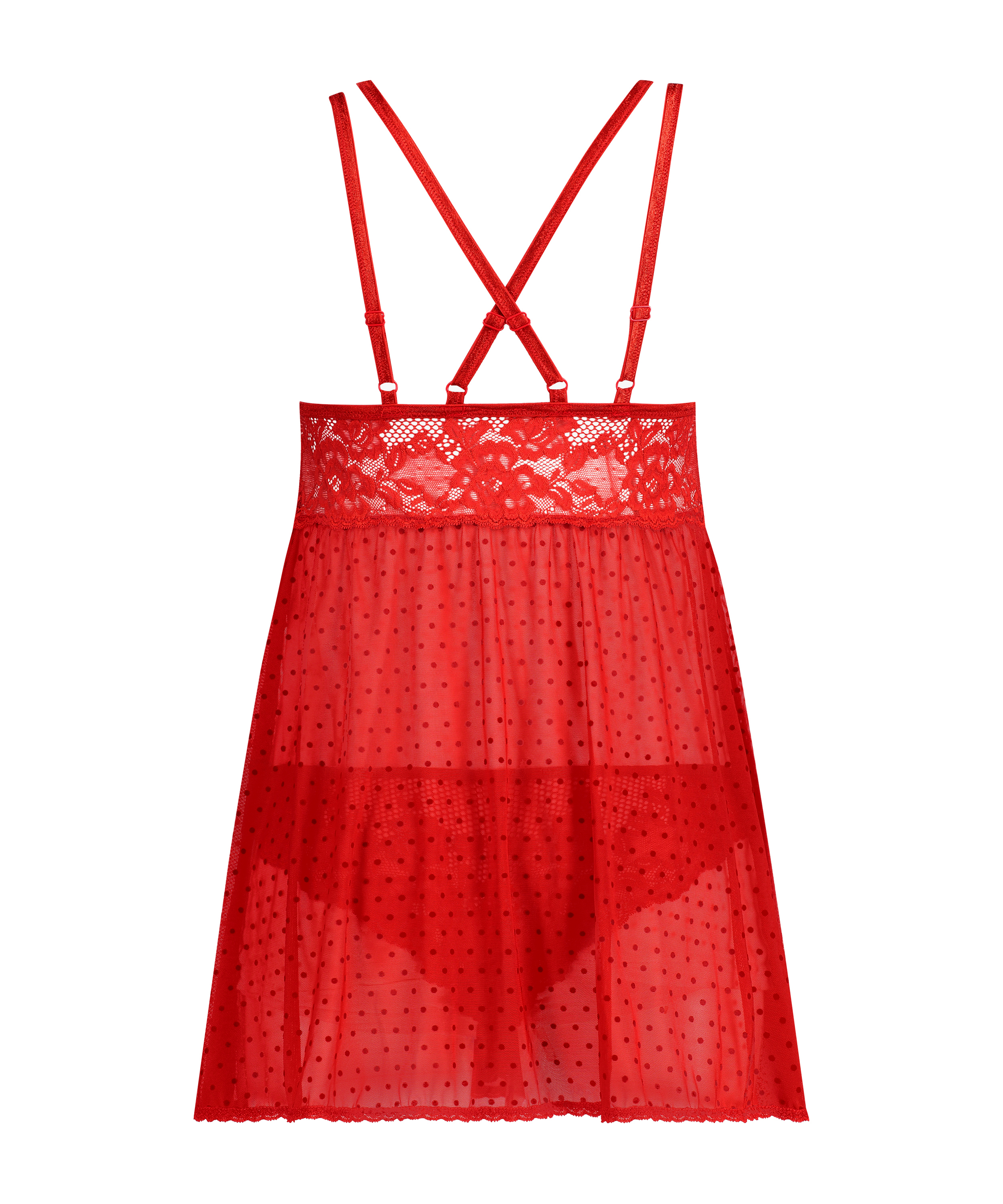 Voel je sexy in deze non-wired babydoll! De babydoll heeft kanten en mesh details, verstelbare bandjes en is afgewerkt met een stipjespatroon. De bijpassende slip is gemaakt van een mix van kant en mesh.