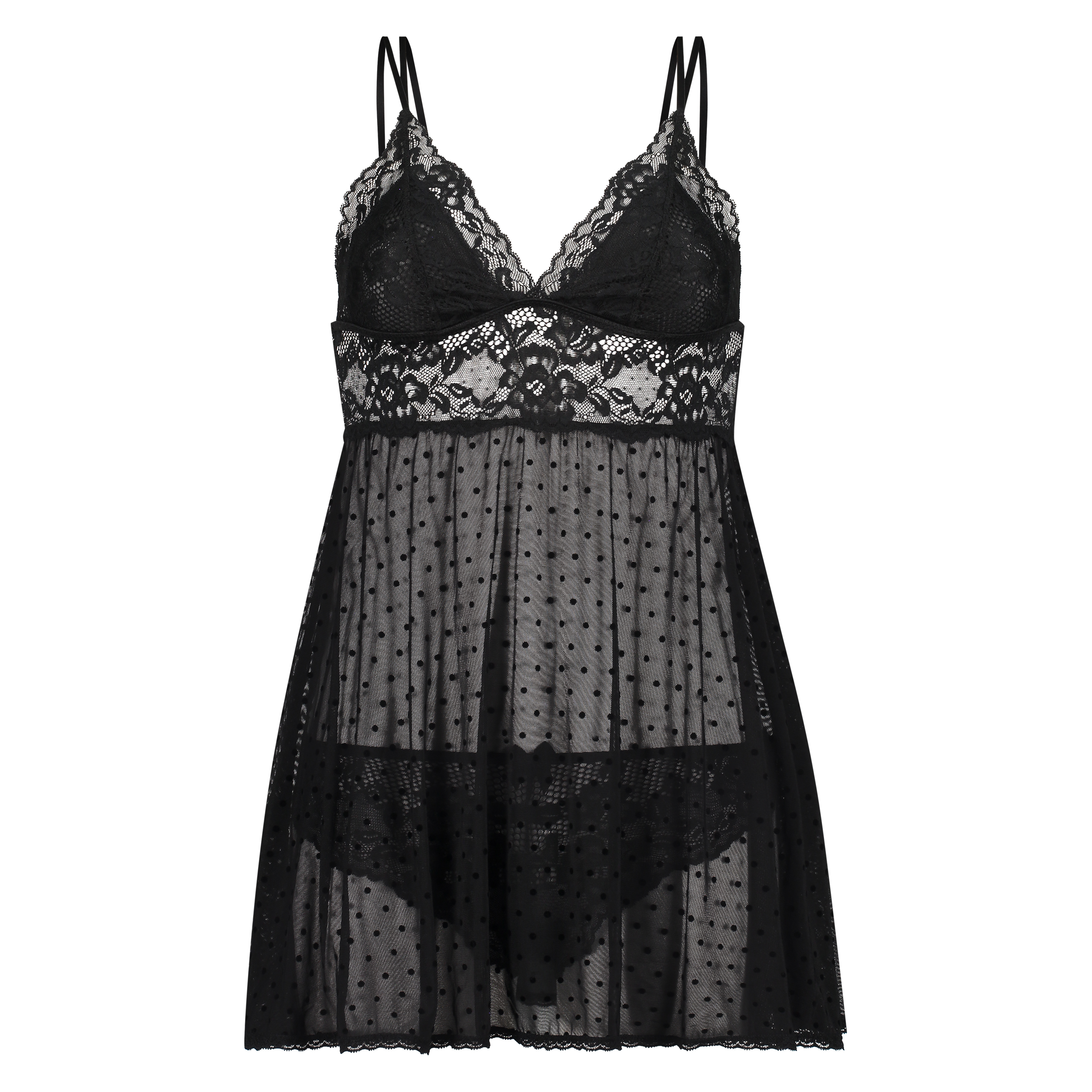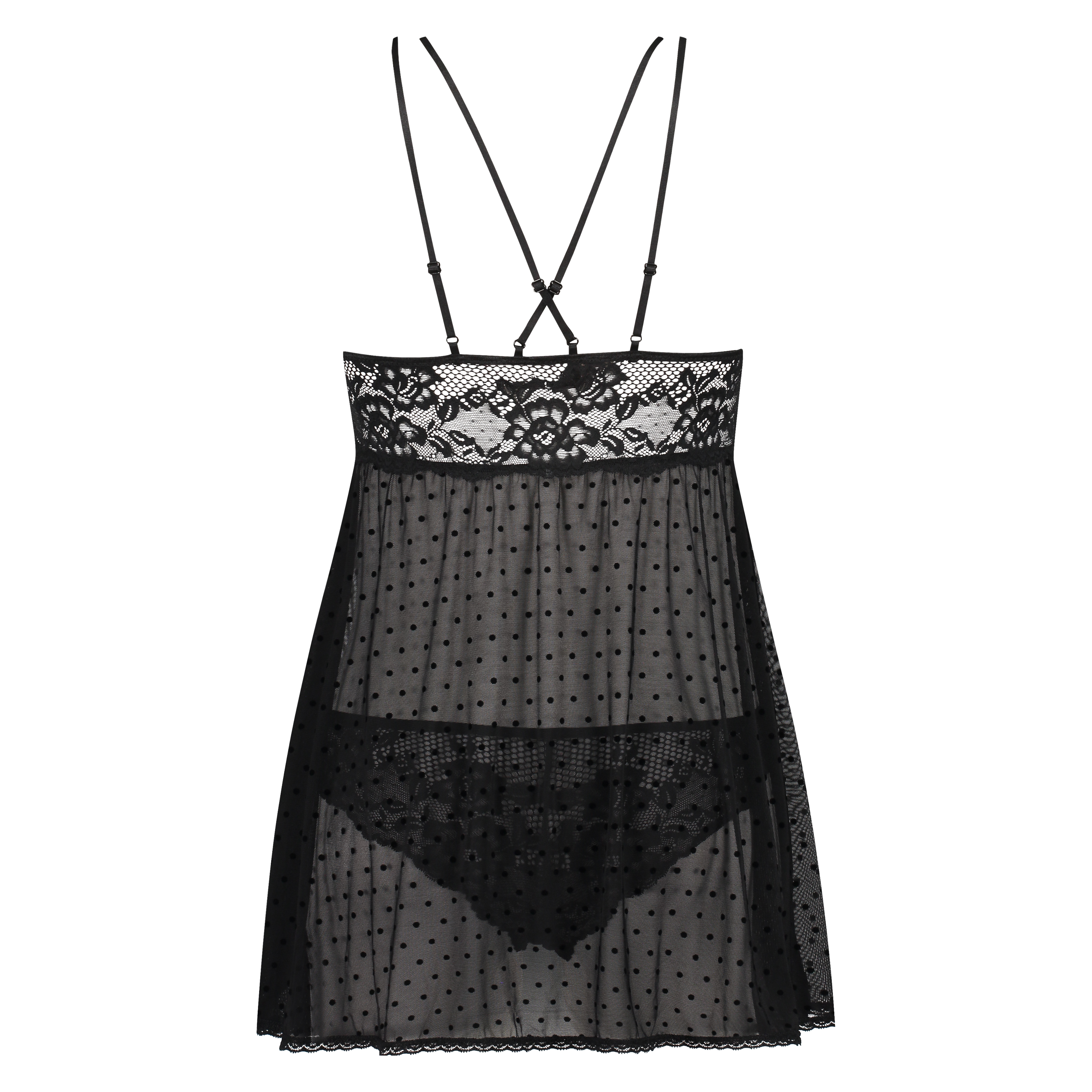 Voel je sexy in deze non-wired babydoll! De babydoll heeft kanten en mesh details, verstelbare bandjes en is afgewerkt met een stipjespatroon. De bijpassende slip is gemaakt van een mix van kant en mesh.