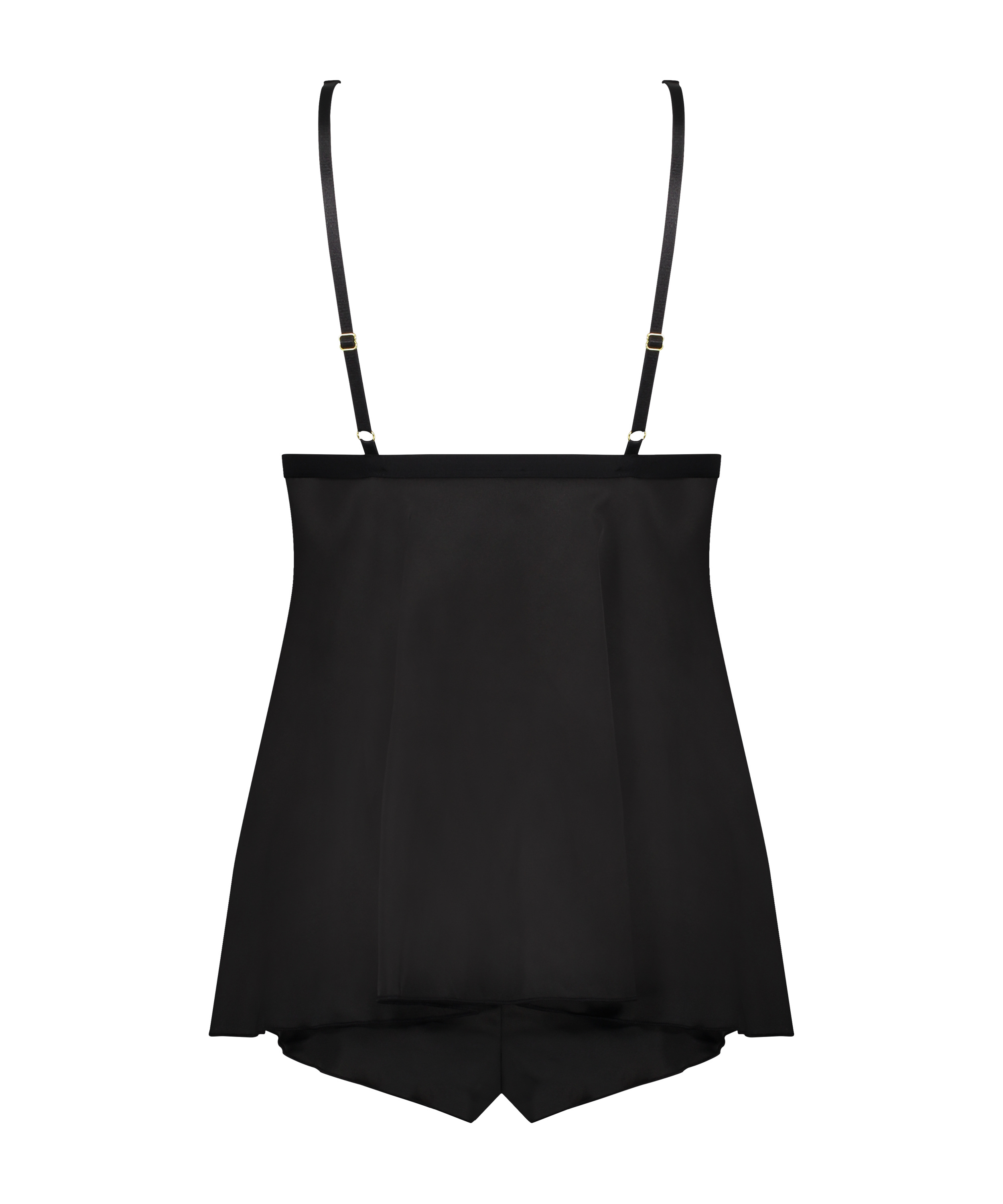 Op zoek naar een sexy babydoll? Dan is dit de perfecte. De voorkant is open en de babydoll heeft een satijn-achtige stof. De bandjes zijn verstelbaar en het kant loopt over de schouders door. Match met een bijpassende slip.