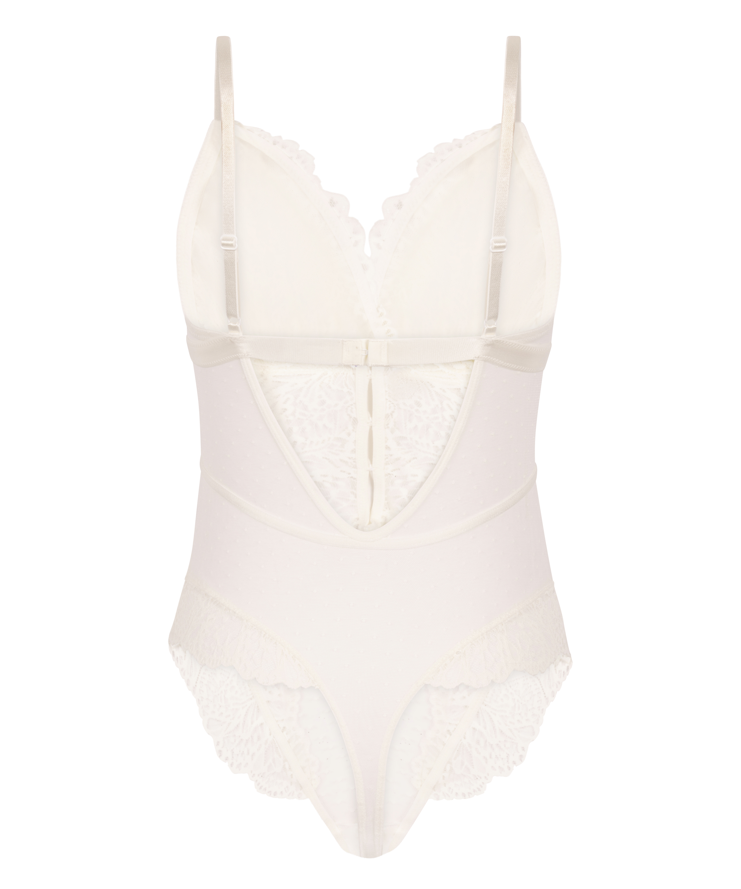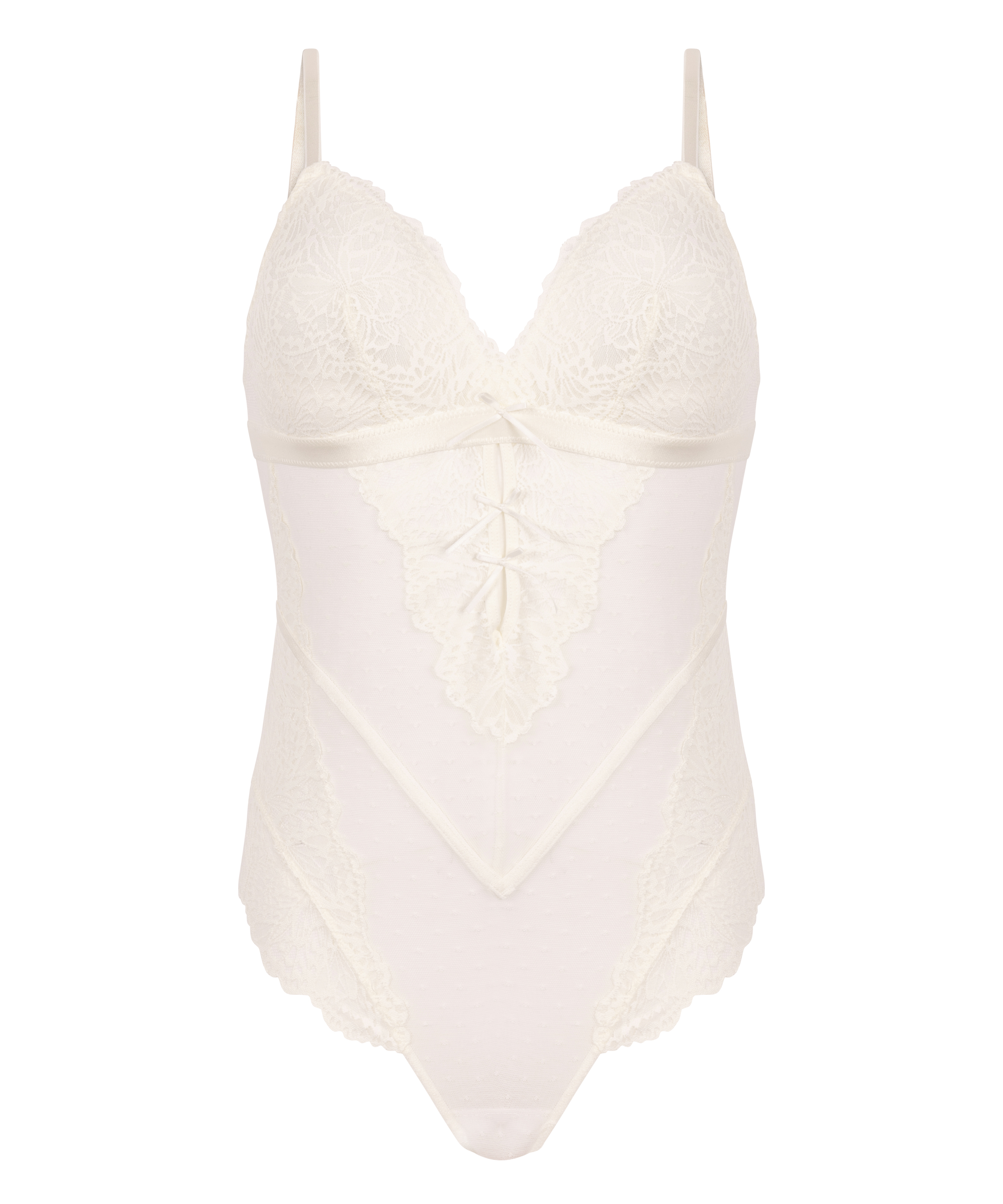 Charmeer in deze prachtige body, gemaakt van netstof en versierd met kanten details aan de halslijn en zijkanten. Decoratieve strikjes voegen een speels tintje toe.