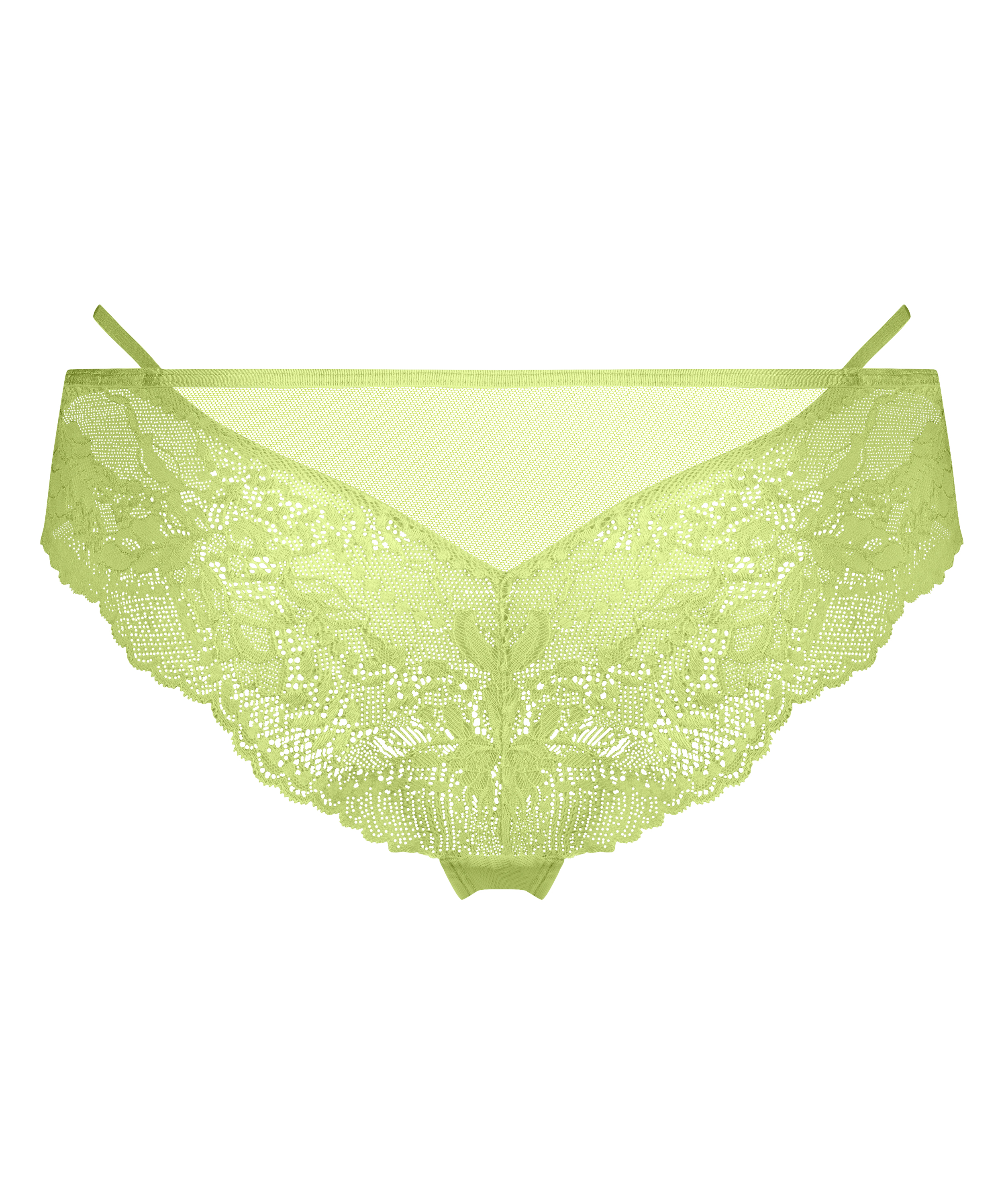 Deze brazilian heeft echt dat wauw-effect! De slip is met heel veel kant afgewerkt en bevat een strikje aan de voorzijde. Match met bijpassende bralette of bh om je set compleet te maken.