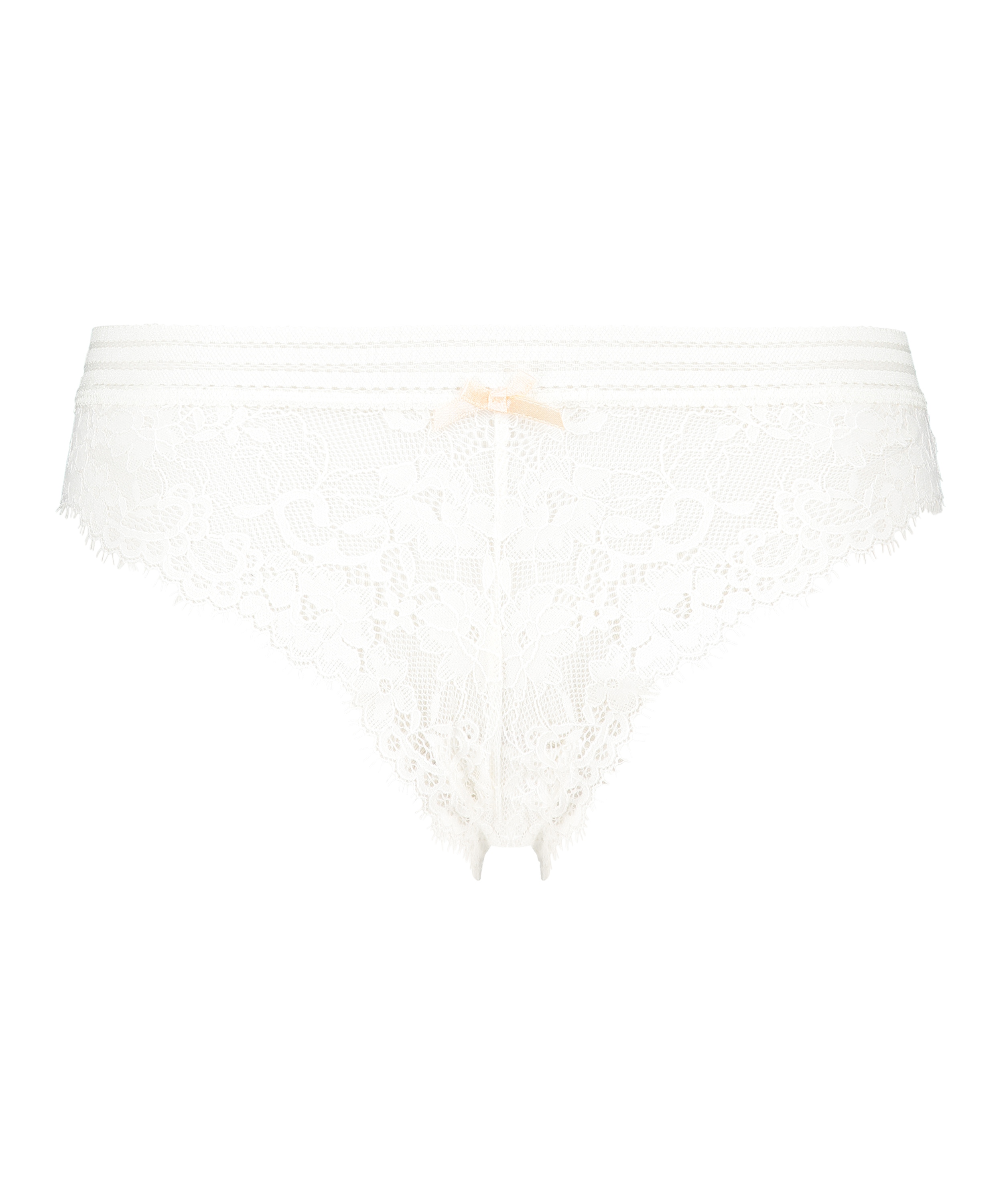 Deze brazilian bestaat bijna volledig uit kant! Super nice! De slip bevat een fijne elastische band en een cute strikje. Match met bijpassende bh of bralette voor een complete set.