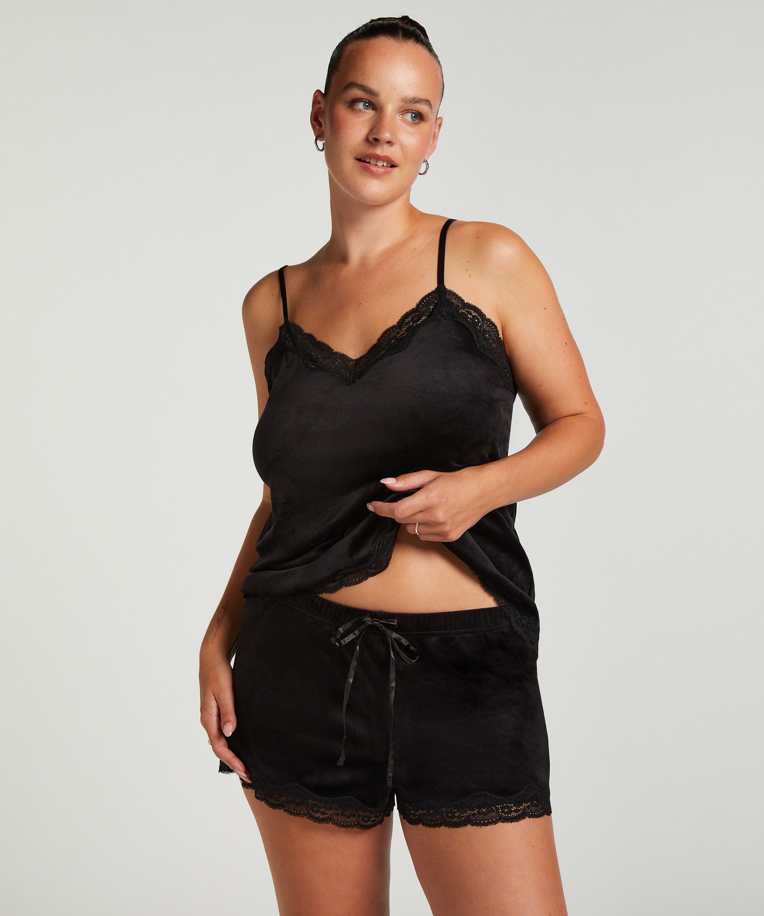Voel je super sexy en vrouwelijk met deze zachte top aan! De top is gemaakt van een velours stof en is afgewerkt met kant. Combineer met de matchende items.