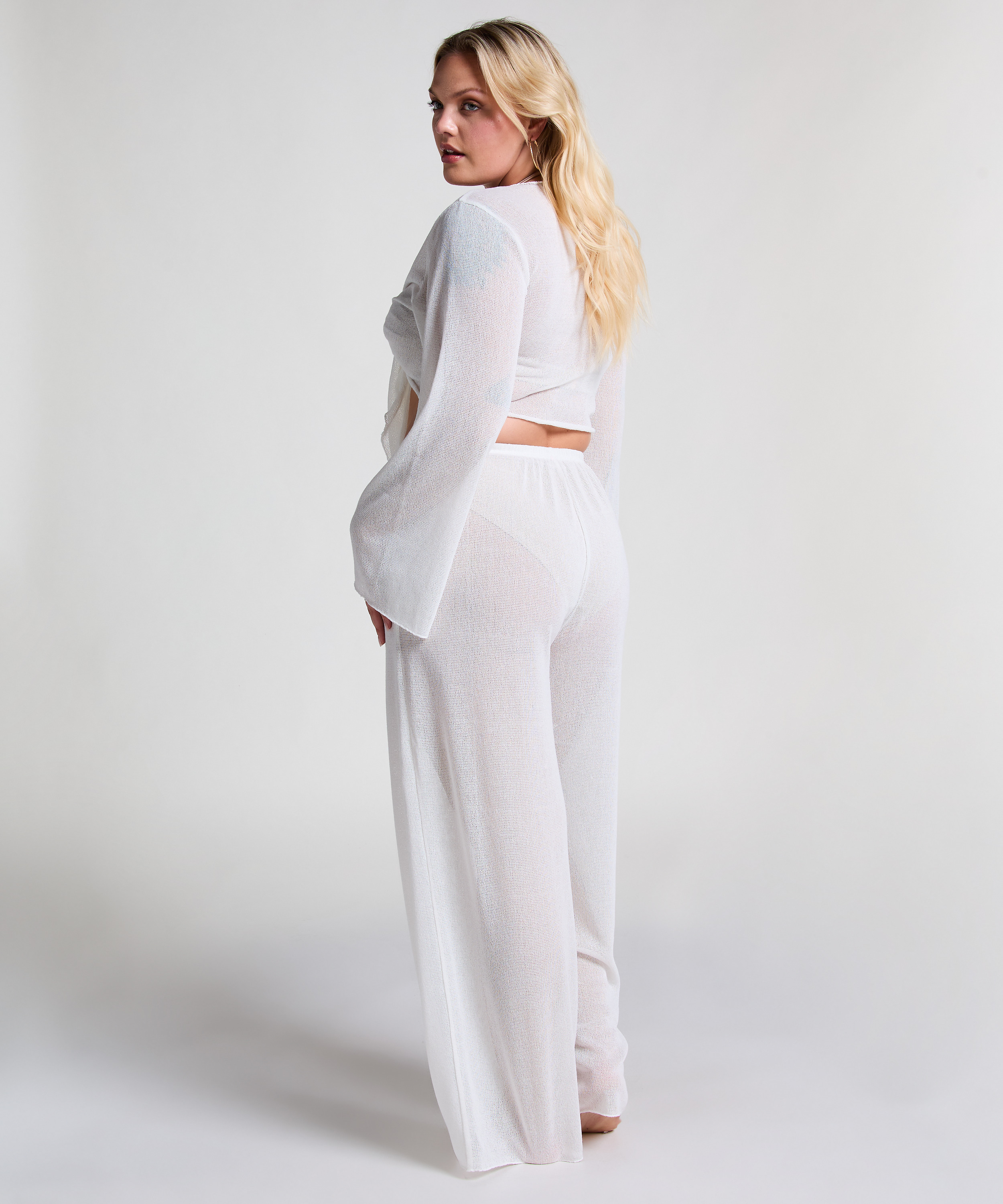 Omarm een moeiteloze stijl met deze gebreide strandbroek! Het doorschijnende ontwerp biedt een chique en luchtig gevoel, perfect om over zwemkleding te dragen. Lichtgewicht en comfortabel, het ultieme stuk voor een ontspannen maar stijlvolle strandlook.
