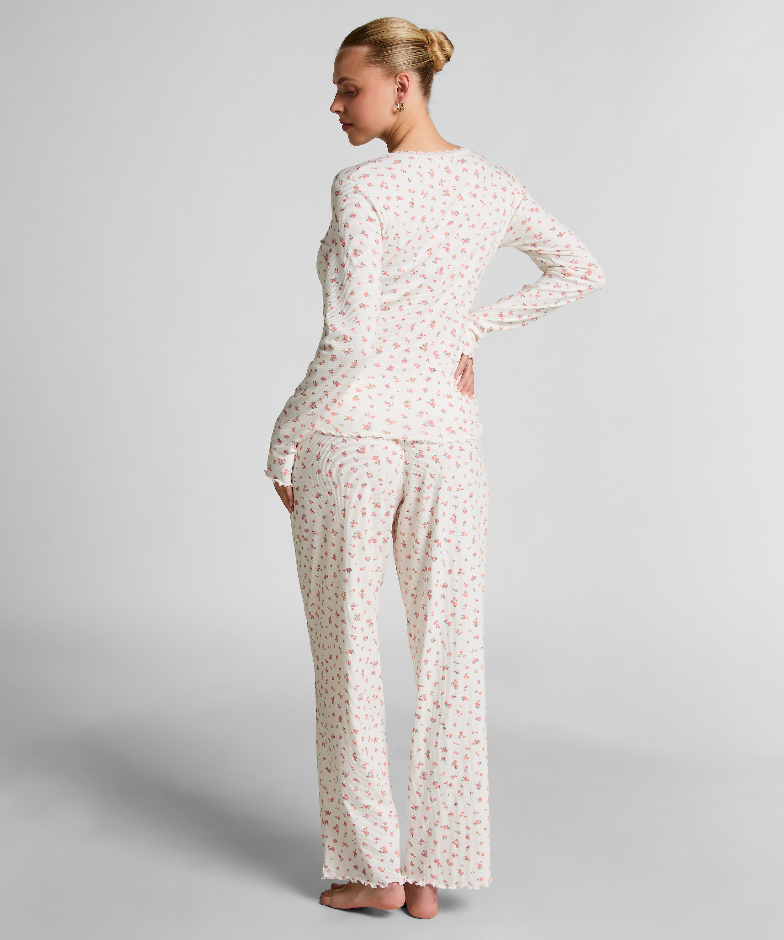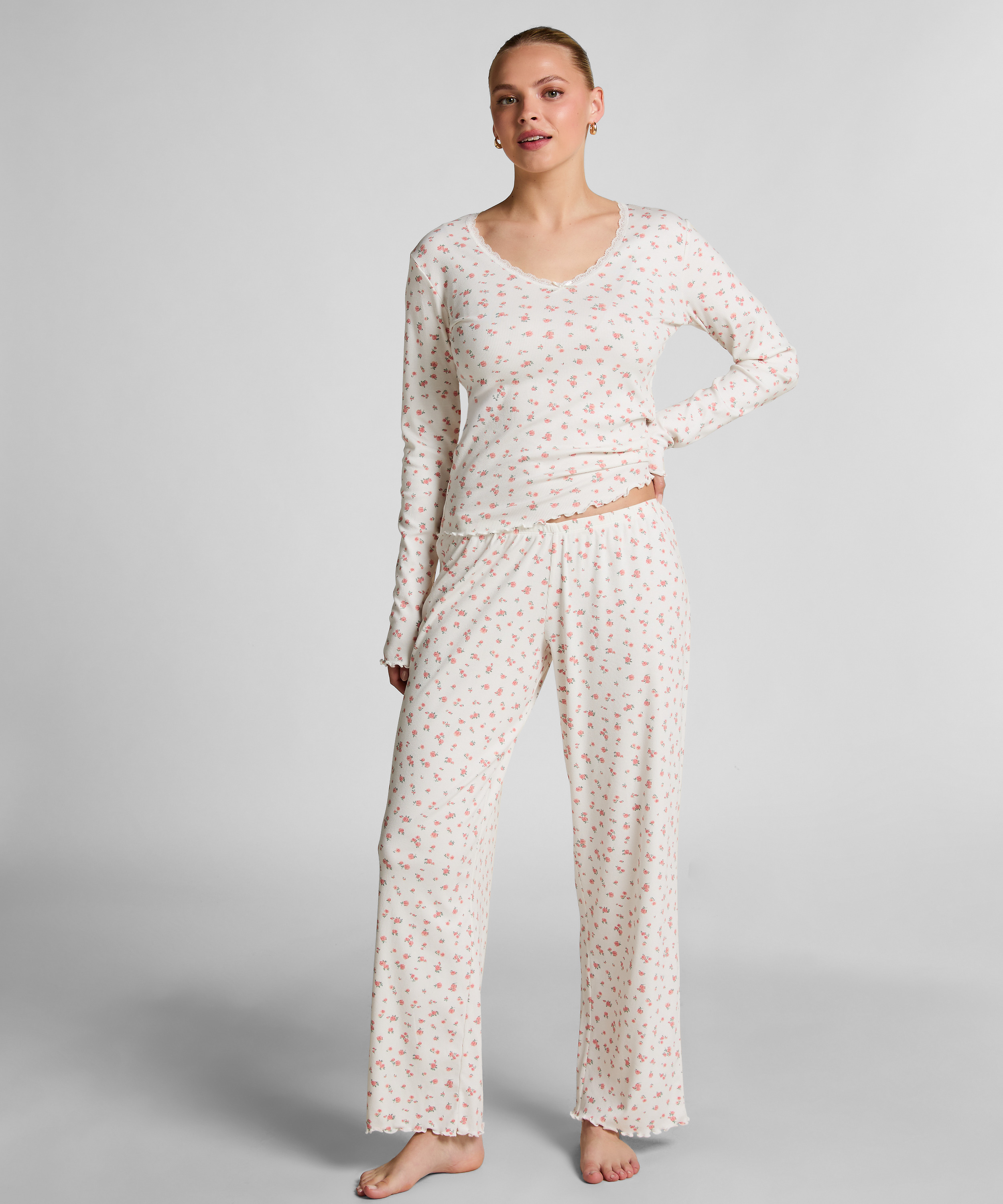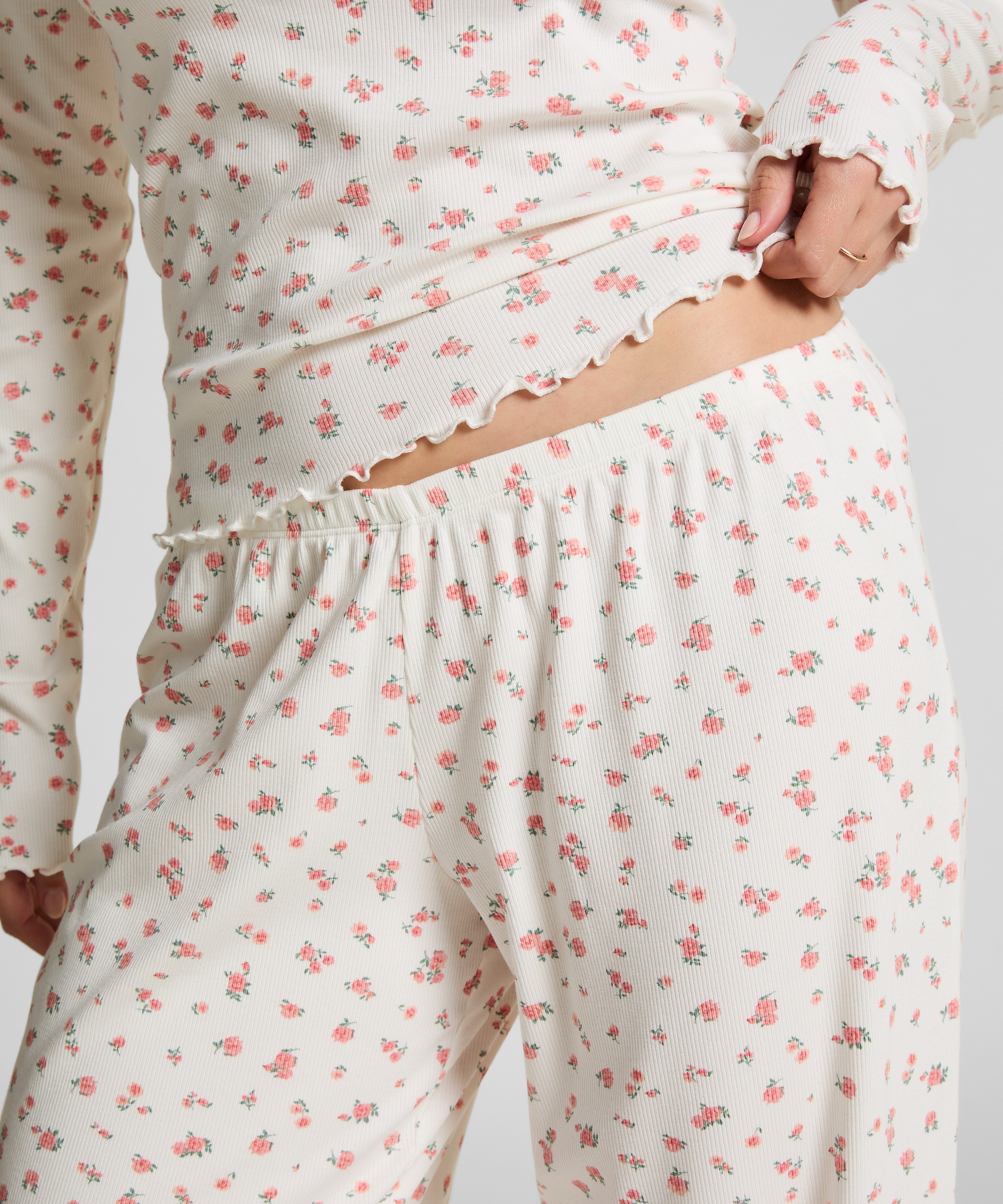 Knus comfort met een flirterige afwerking! Deze geribde pyjamabroek heeft een elastische tailleband en delicate ruches langs de zoom, waardoor hij perfect is voor ontspannen avonden en rustige nachten.