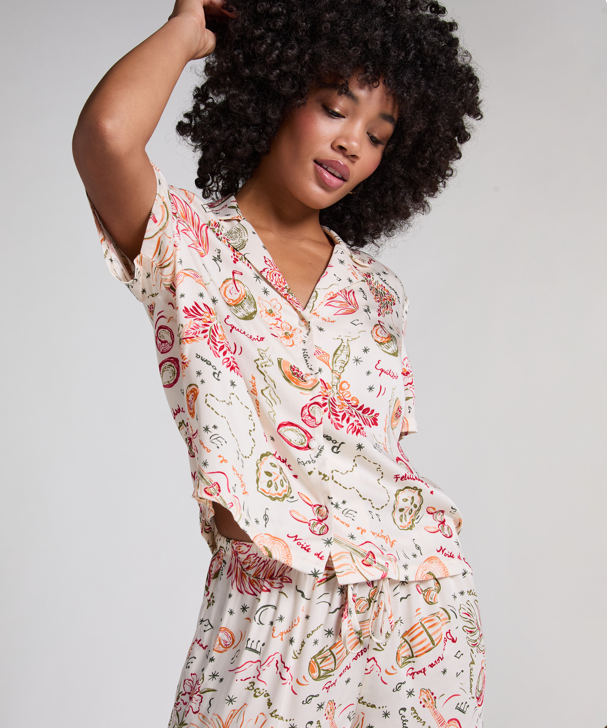 Dit slaapshirt heeft een zachte, lichtgewicht stof die ultiem comfort biedt voor een rustgevende nacht. De elegante kraag met een geplooid ontwerp en V-halslijn voegen een vleugje verfijning toe. Met stof bedekte knopen maken de verfijnde look af voor een rustige en stijlvolle slaapervaring.