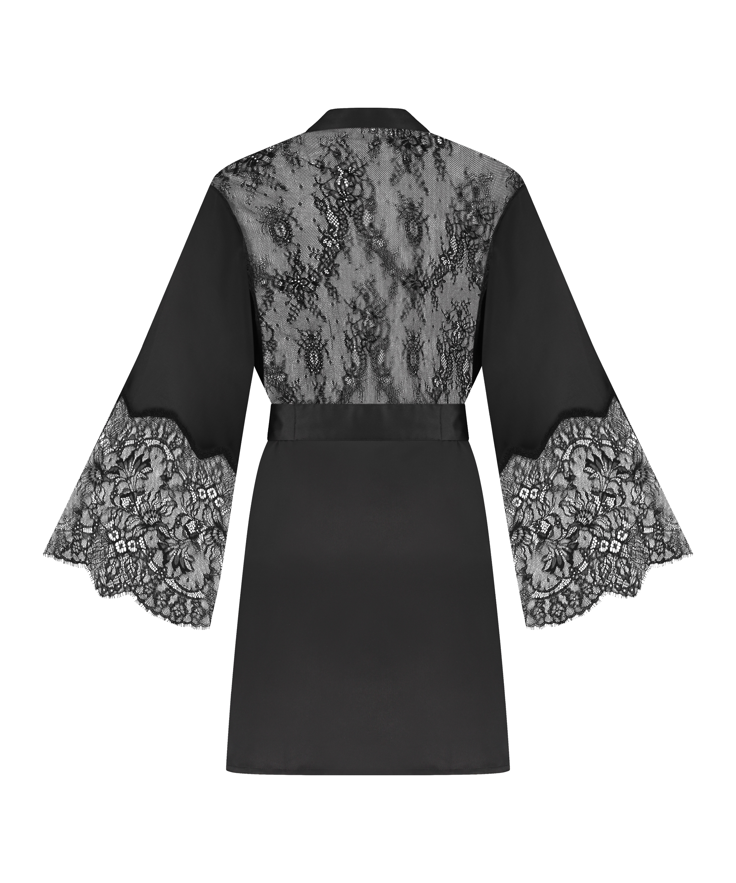 Mis deze elegante kimono niet! Met veel romantisch kant en een echte striksluiting. Deze schattige kimono heeft wijde mouwen en is gemaakt van satijnmateriaal wat het een luxe uitstraling geeft. Combineer ze met bijpassende artikelen. Onderdeel van onze Noir collectie.