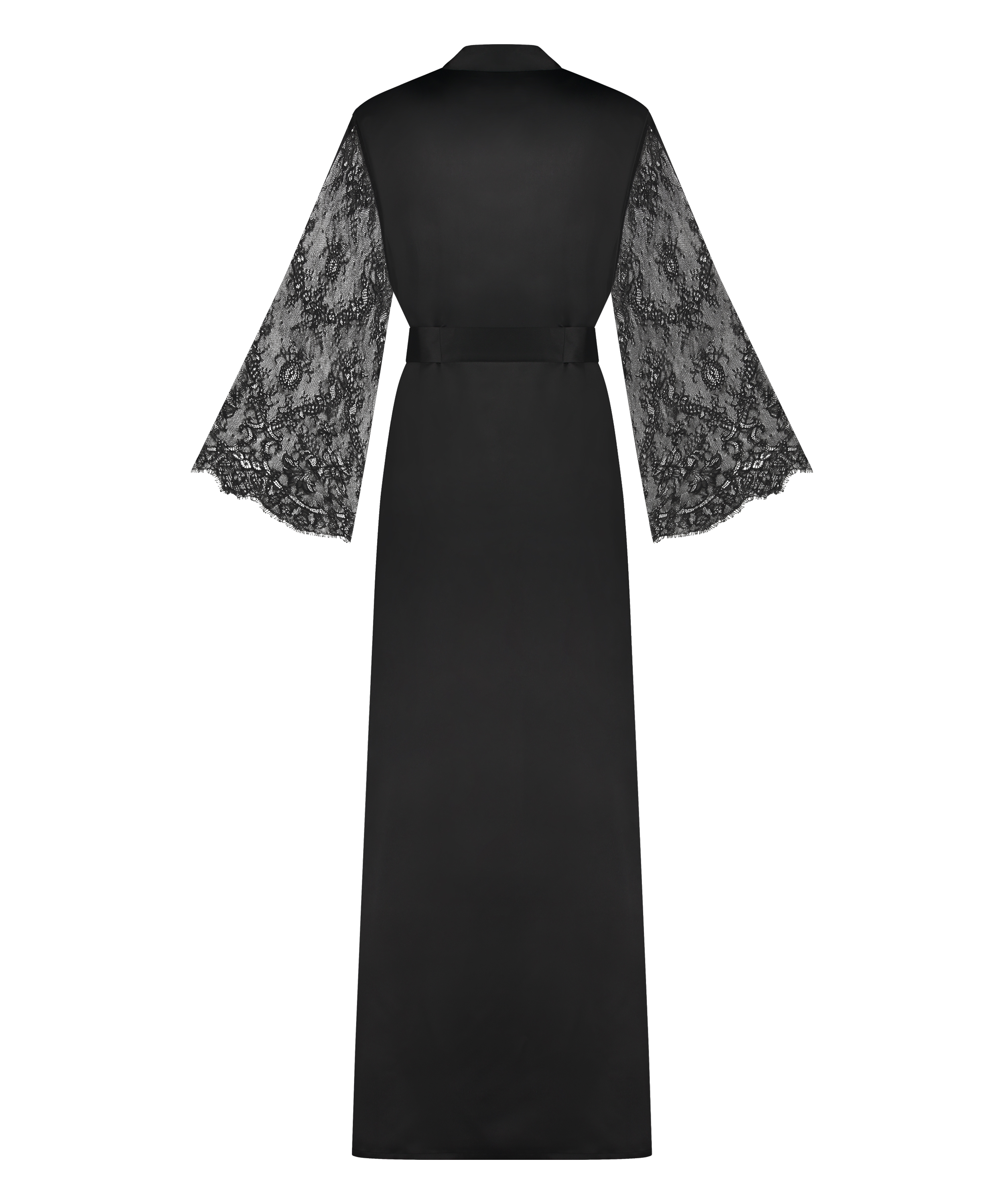 Mis deze elegante kimono niet! Met veel romantisch kant en een echte striksluiting. Deze schattige kimono heeft wijde mouwen en is gemaakt van satijnmateriaal wat het een luxe uitstraling geeft. Combineer ze met bijpassende artikelen. Onderdeel van onze Noir collectie.