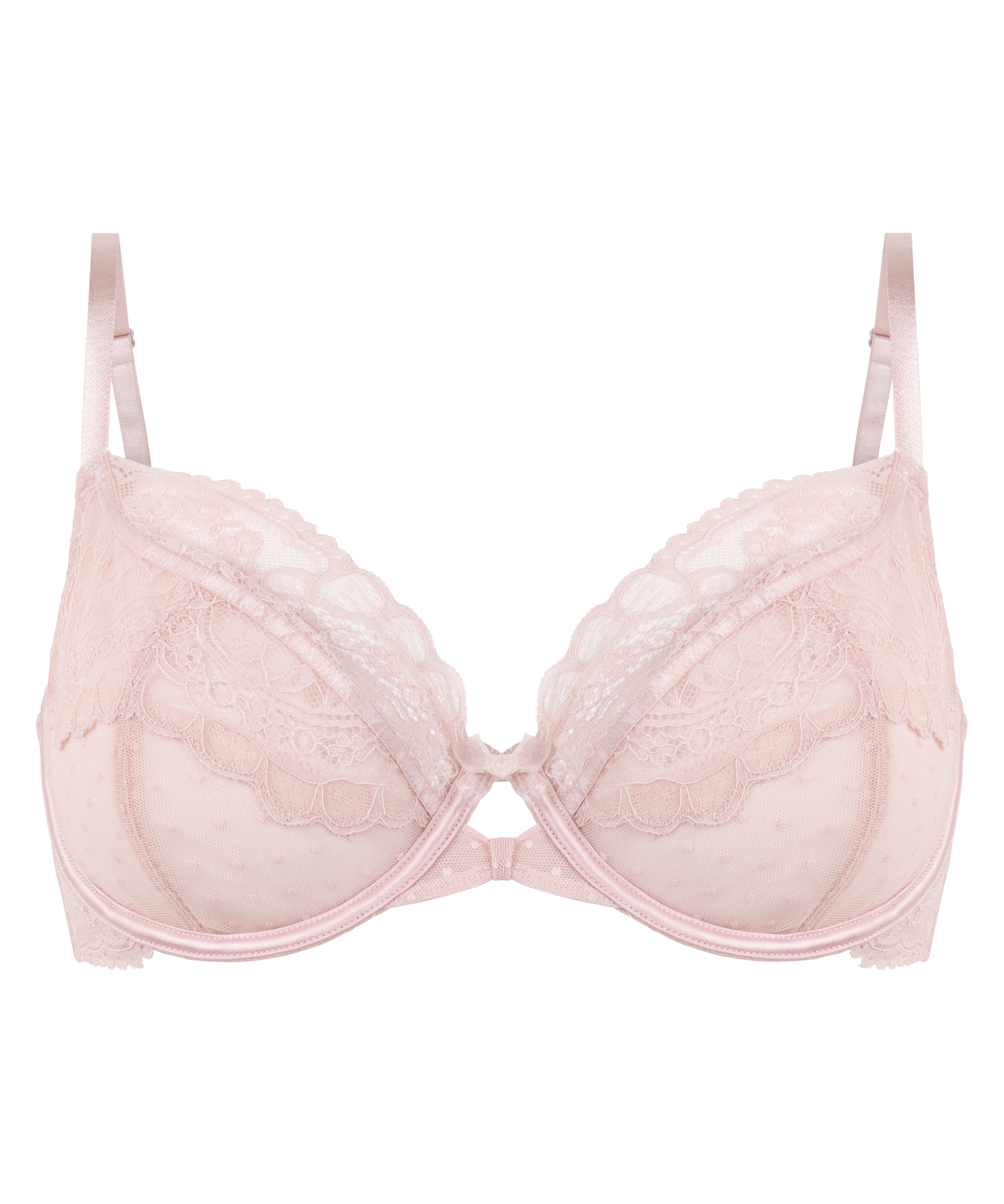 Voeg een vleugje vrouwelijkheid toe aan je lingeriecollectie met deze beha. Het kant aan de bovenkant van de cups zorgt voor een romantische uitstraling, terwijl het gestippelde gaas aan de onderkant voor een speels contrast zorgt. Met ondersteunende beugels en een elegant strikje in het midden combineert deze bh comfort en stijl.