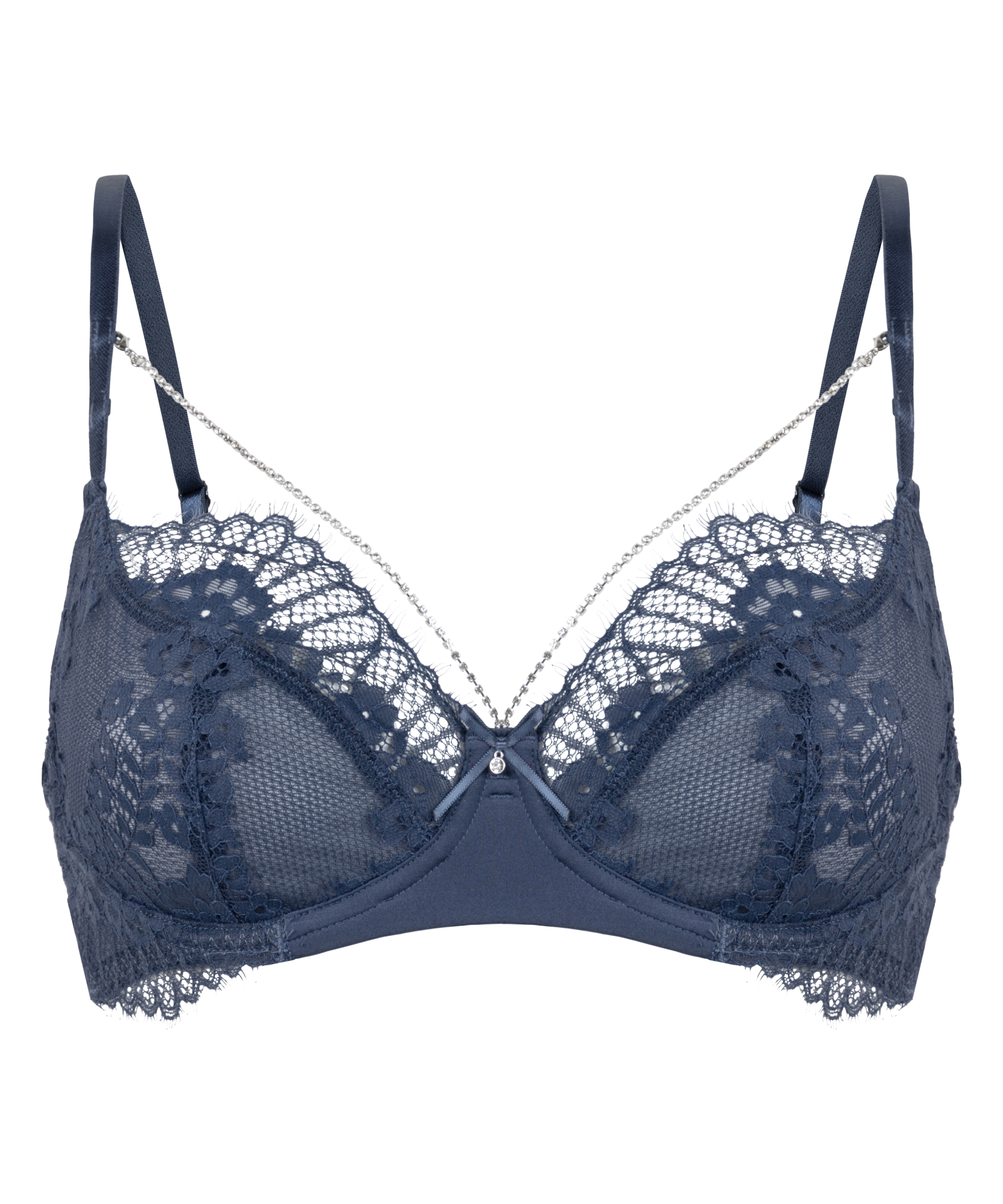 Voel je onweerstaanbaar sexy in deze niet-voorgevormde beugel-bh! Geniet van de luxe kanten details en een schattig strikje tussen de cups. Inclusief afneembare ketting voor een speelse touch. Maak de look compleet met de bijpassende slipjes!