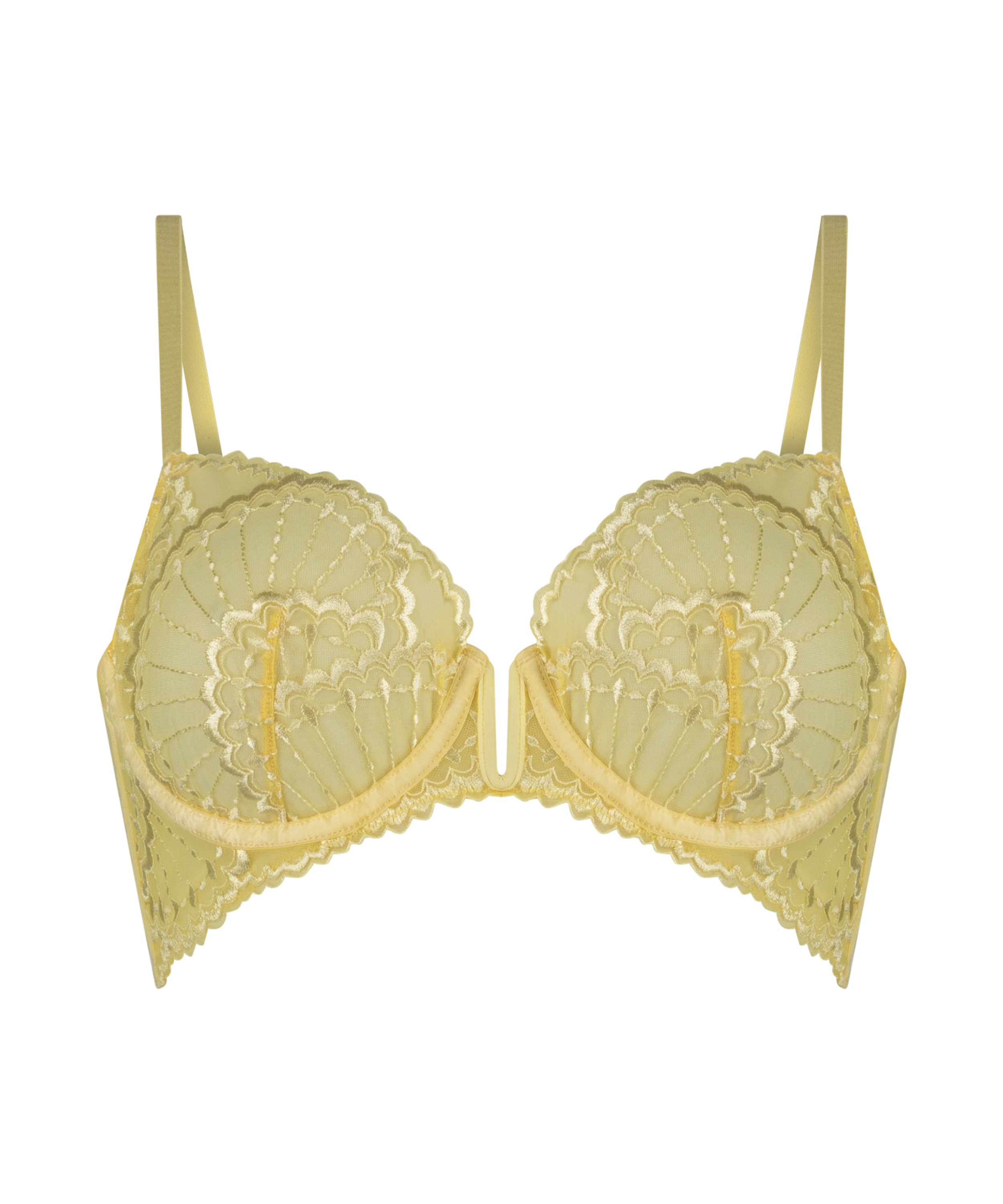 Straal in deze luxe en elegante bh! Deze niet-voorgevormde bh is gemaakt van delicaat gaas dat rijkelijk is geborduurd met bloemmotieven en straalt tijdloze charme uit. Het heeft een haak- en oogsluiting op de rug en verstelbare bandjes voor een verstelbare pasvorm. Combineer hem met een bijpassend broekje om de look compleet te maken!