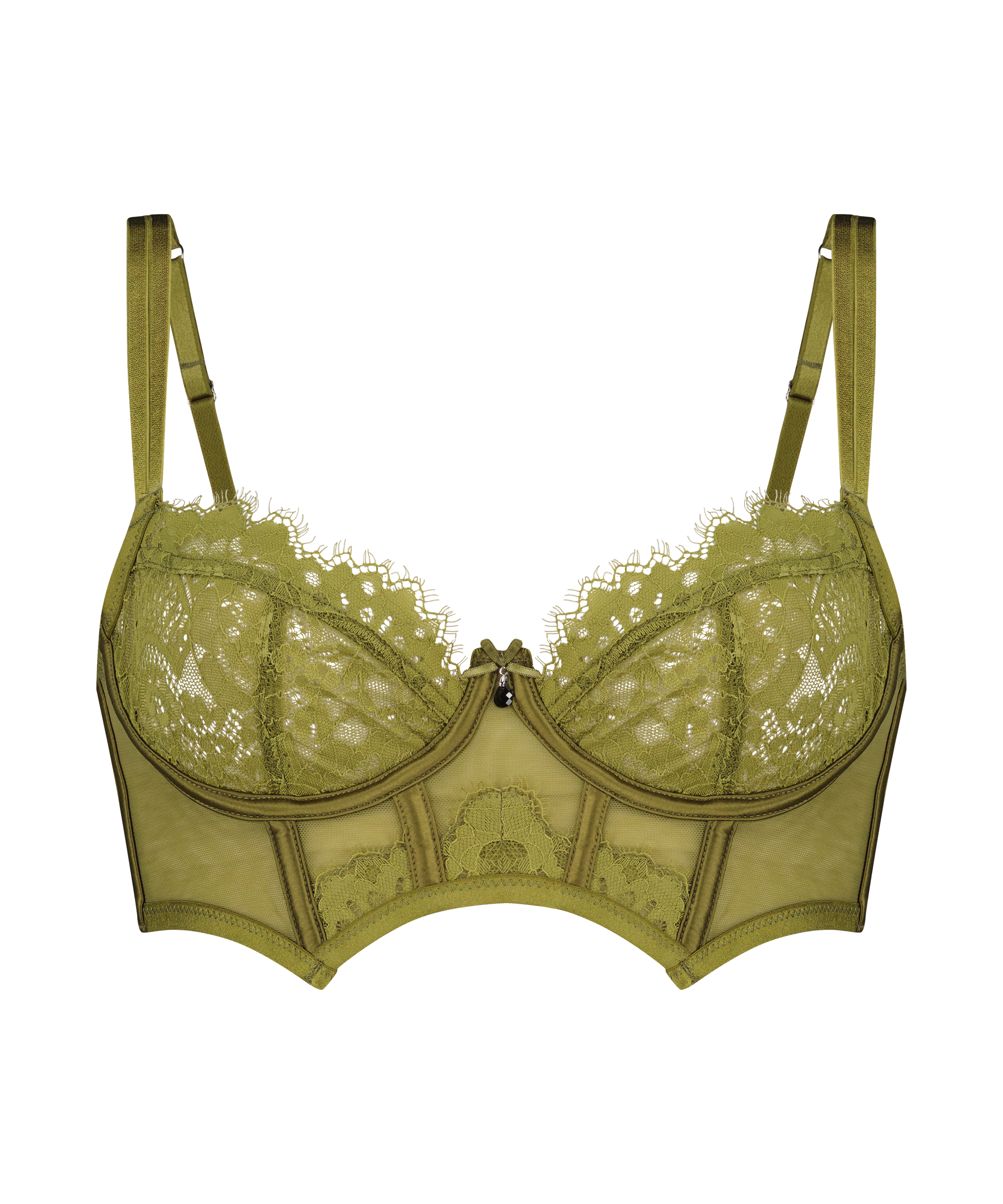 Verwen jezelf met onze must-have Amelie longline bh! Moeiteloos chic en elegant niet voorgevormd ontwerp met beugel, waardoor je er fantastisch uitziet en je je ook zo voelt. Met kanten details en een delicaat strikje met sieraden voor een luxe afwerking van je look. Combineer hem met je favoriete stukken uit de Amelie collectie en creëer een echt lingerie pronkstuk!