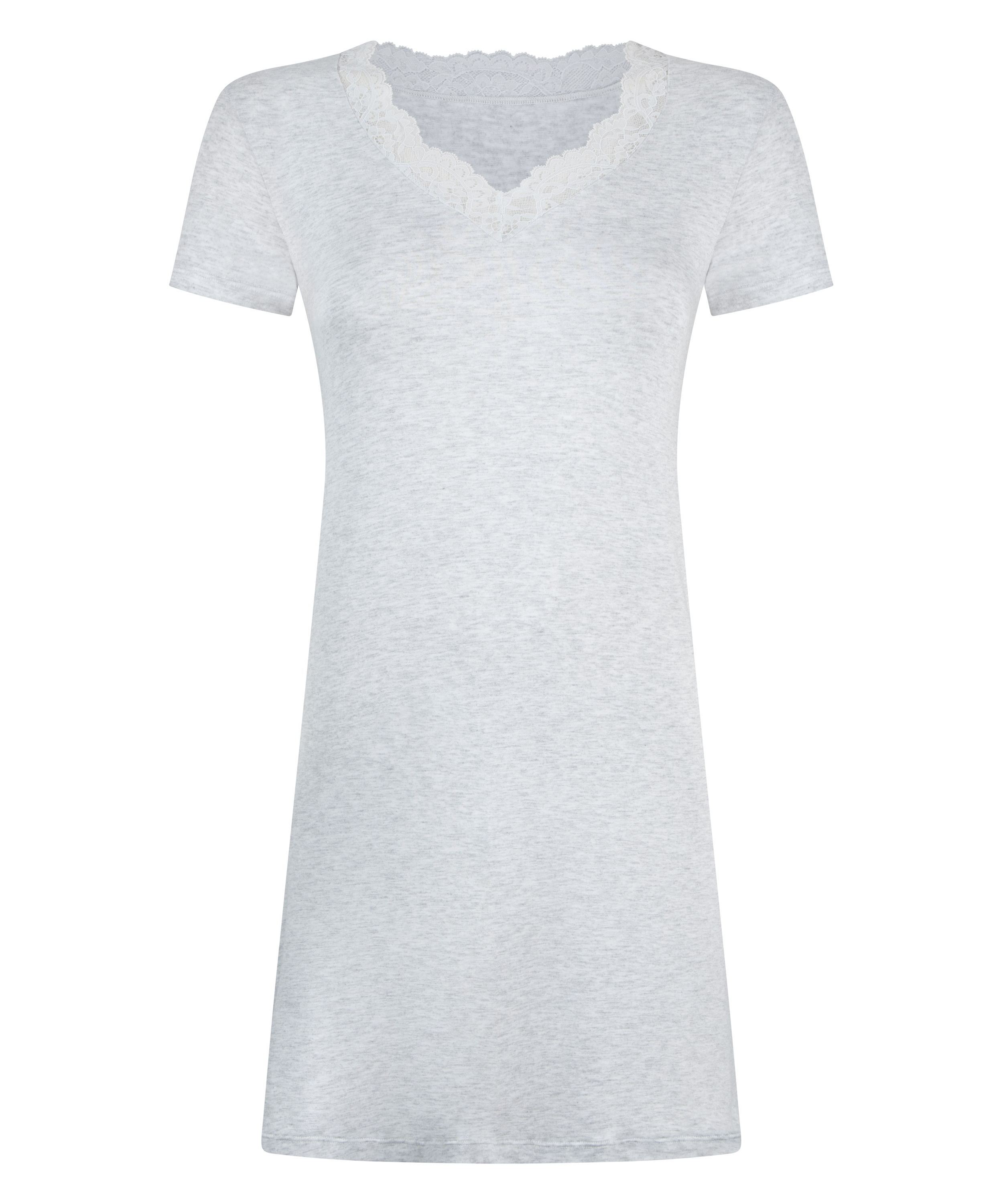 Droom weg in stijl met dit nachthemd, een perfecte mix van comfort en elegantie. Dit nachthemd van zachte, ademende jerseystof zorgt voor een ontspannen pasvorm die licht en knus aanvoelt tegen je huid. De flatterende V-hals is versierd met kant, wat een vleugje vrouwelijkheid toevoegt aan dit klassieke ontwerp.