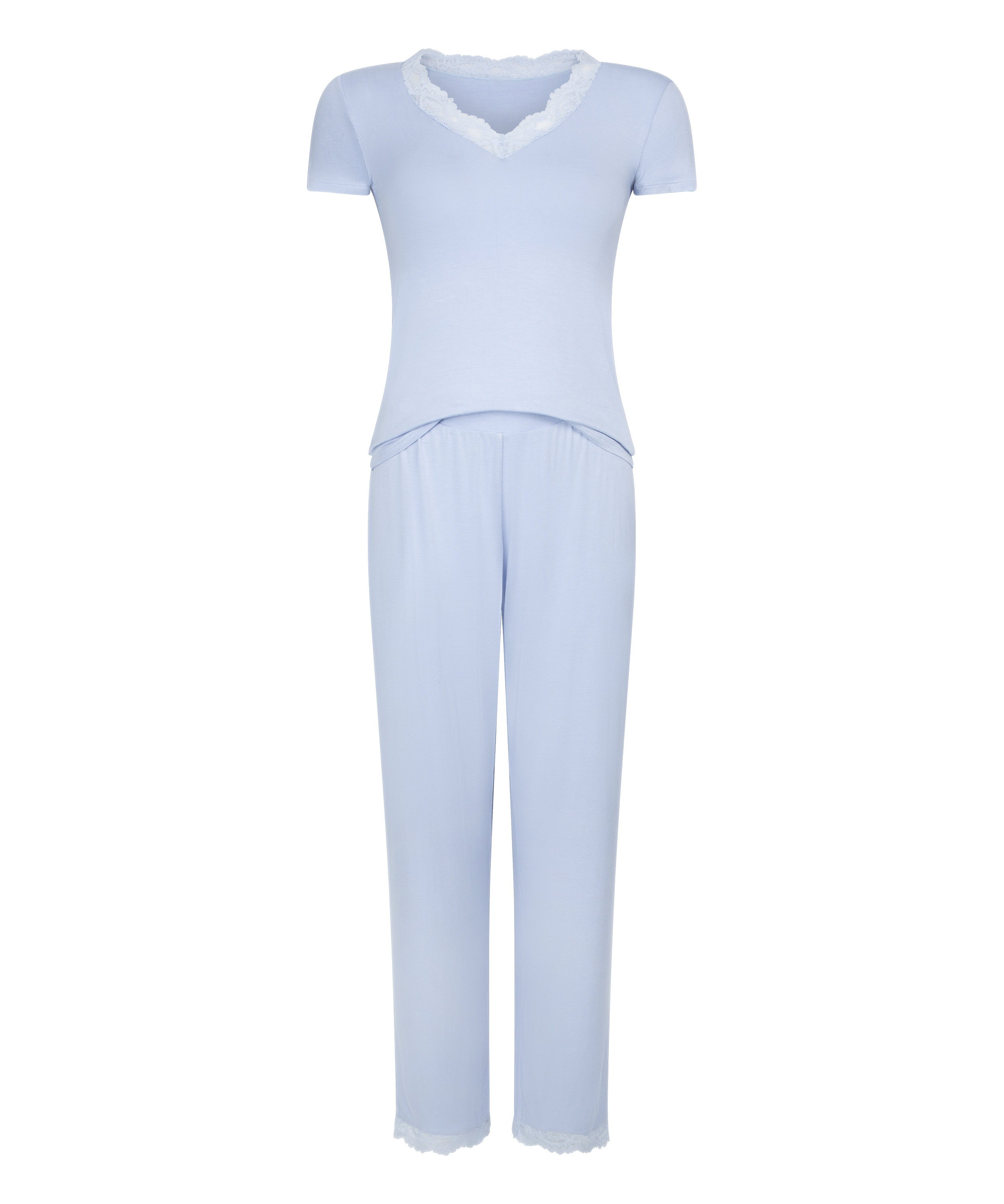 Ontspan in stijl met onze pyjama, ontworpen voor ultiem comfort en elegantie. Deze tweedelige set heeft een zachte, ademende top met korte mouwen en een flatterende V-hals versierd met kant. Met een lange, vloeiende broek voor een relaxte pasvorm en kanten details aan de onderkant. Deze set is perfect om in te loungen of te slapen.