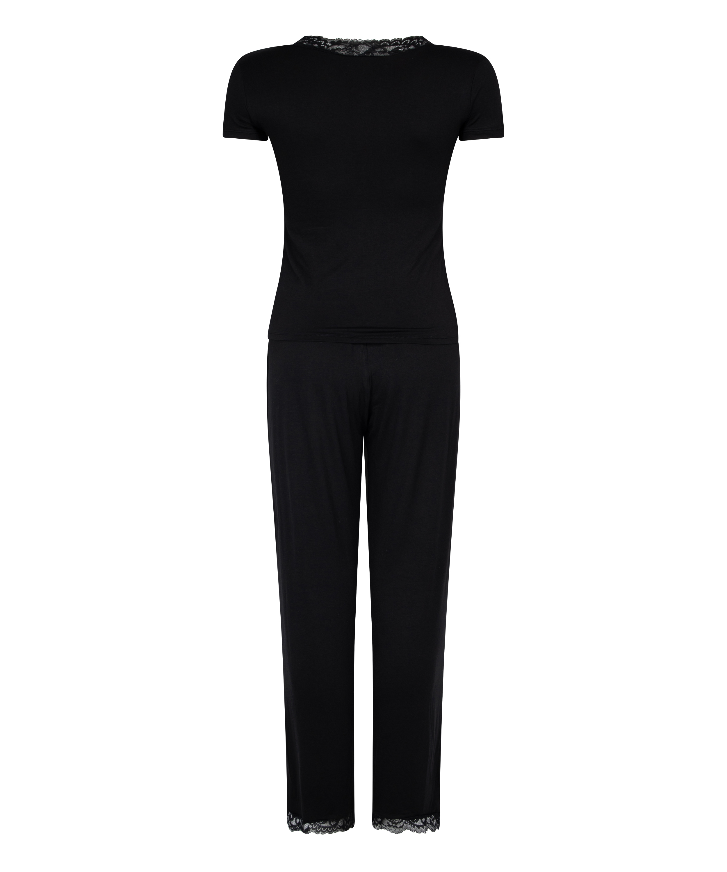 Ontspan in stijl met onze pyjama, ontworpen voor ultiem comfort en elegantie. Deze tweedelige set heeft een zachte, ademende top met korte mouwen en een flatterende V-hals versierd met kant. Met een lange, vloeiende broek voor een relaxte pasvorm en kanten details aan de onderkant. Deze set is perfect om in te loungen of te slapen.