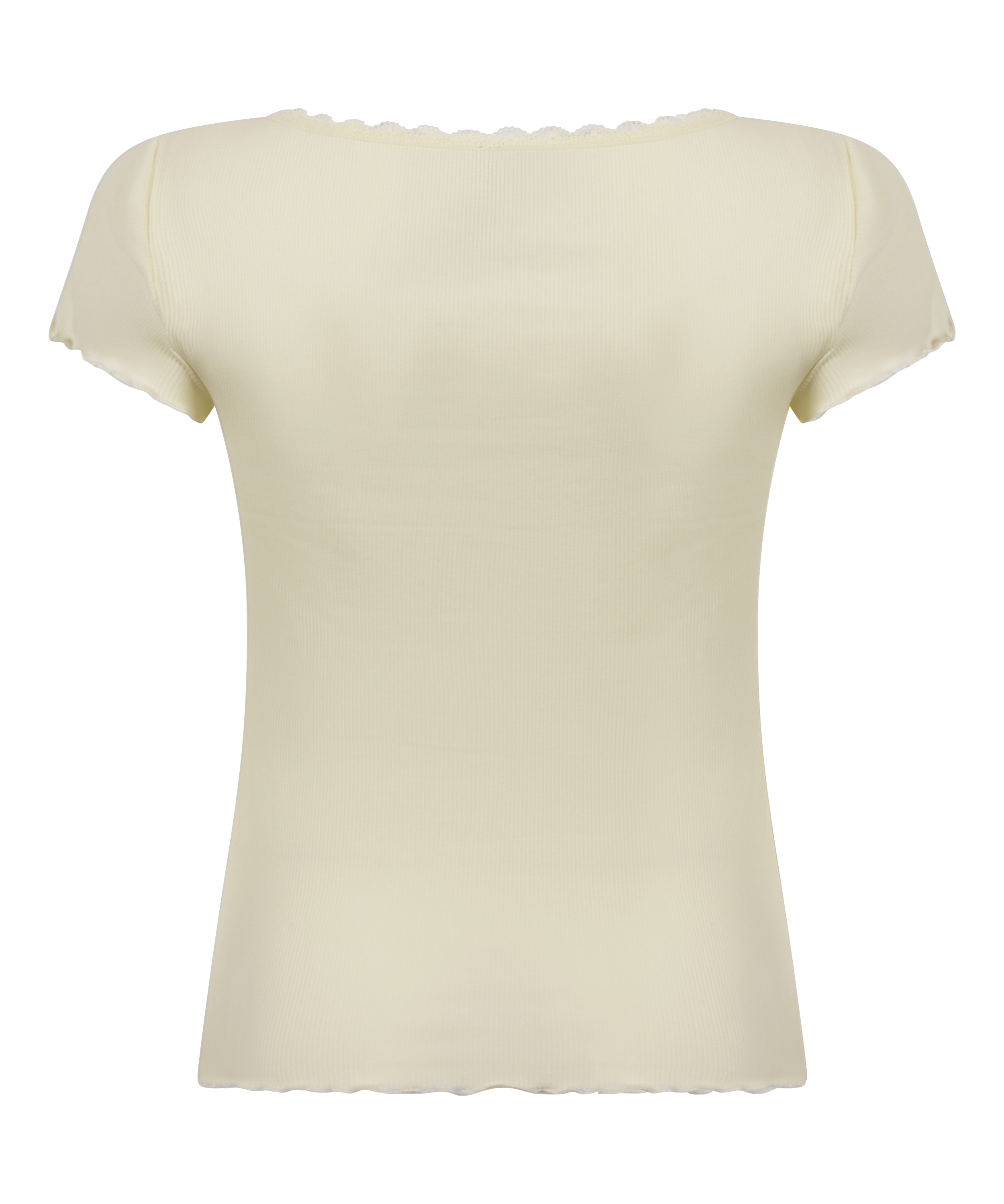 Voel je knus in deze pyjamatop met korte mouwen, ronde hals en kanten details. Ruches aan de mouwen en zoom zorgen voor een speels accent. De zachte, rekbare stof zorgt de hele nacht voor comfort.