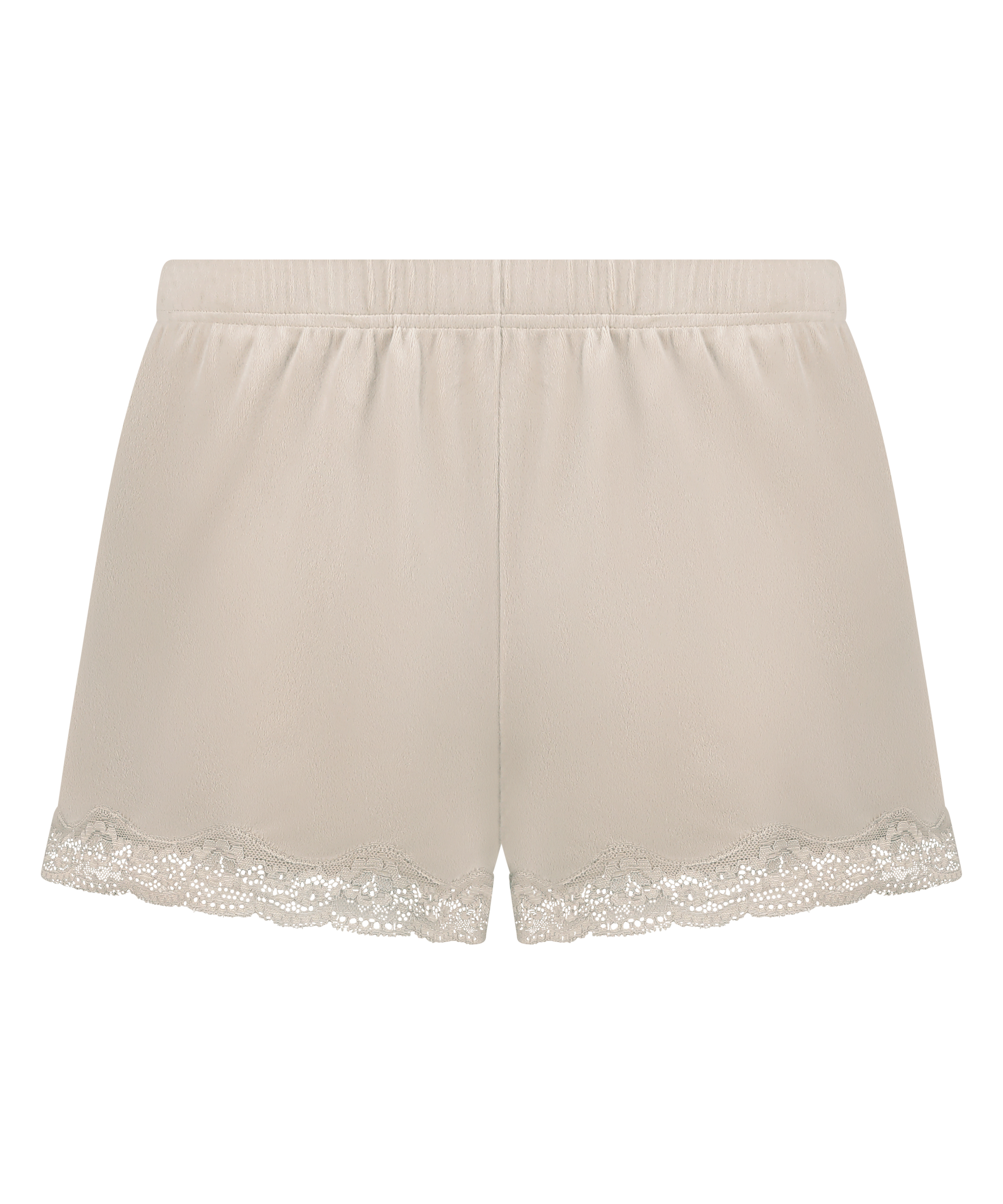 Geniet van comfort met onze velours short, perfect om in stijl te loungen. Deze short is gemaakt van een zachte, fluweelachtige stof en zijn even comfortabel als mooi. De verfijnde kanten accenten voegen een vleugje elegantie en vrouwelijkheid toe en maken deze knusse essential helemaal af. Ontworpen met een gestreepte tailleband voor een comfortabele, flexibele pasvorm zodat je vrij kunt bewegen.