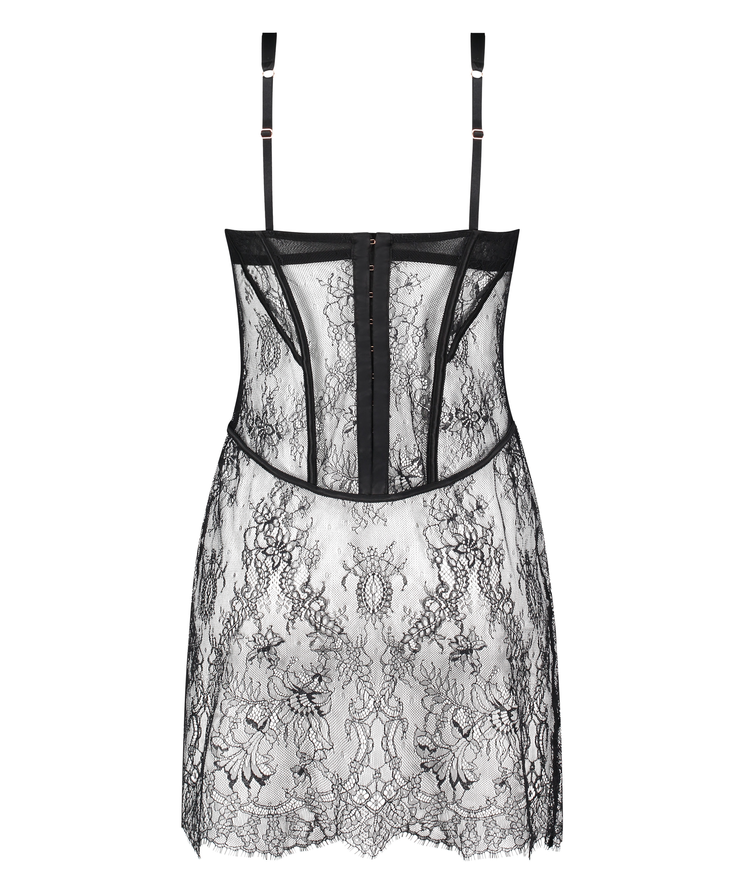Als je je sexy wilt voelen in een slipjurk, dan is dit jouw keuze! Deze slipdress bedekt je volledig met delicaat bloemenkant en geeft de illusie van een getailleerd silhouet dankzij het prachtige baleinontwerp aan de voor- en achterkant. De niet-voorgevormde, dubbellaagse, met kant afgewerkte cups creëren een gedeeltelijk doorschijnend en verleidelijk effect, terwijl de beugel ideale ondersteuning biedt. Voor extra gemak heeft de beha negen haak-en-oogsluitingen voor een veilige sluiting op de rug, aangevuld met verstelbare satijnen bandjes voor een pasvorm op maat. Deze jurk maakt deel uit van onze Noir-collectie en kan worden gecombineerd met een bijpassende string!
