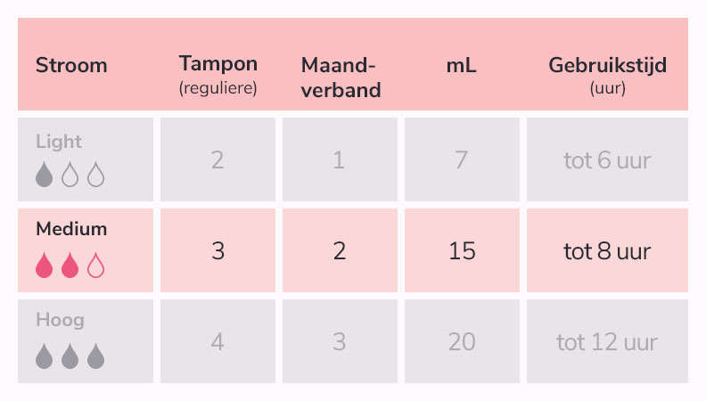● Medium: Je hebt een medium menstruatiestroom als je ongeveer 3 tampons per dag nodig hebt (tot 8 uur absorptie).