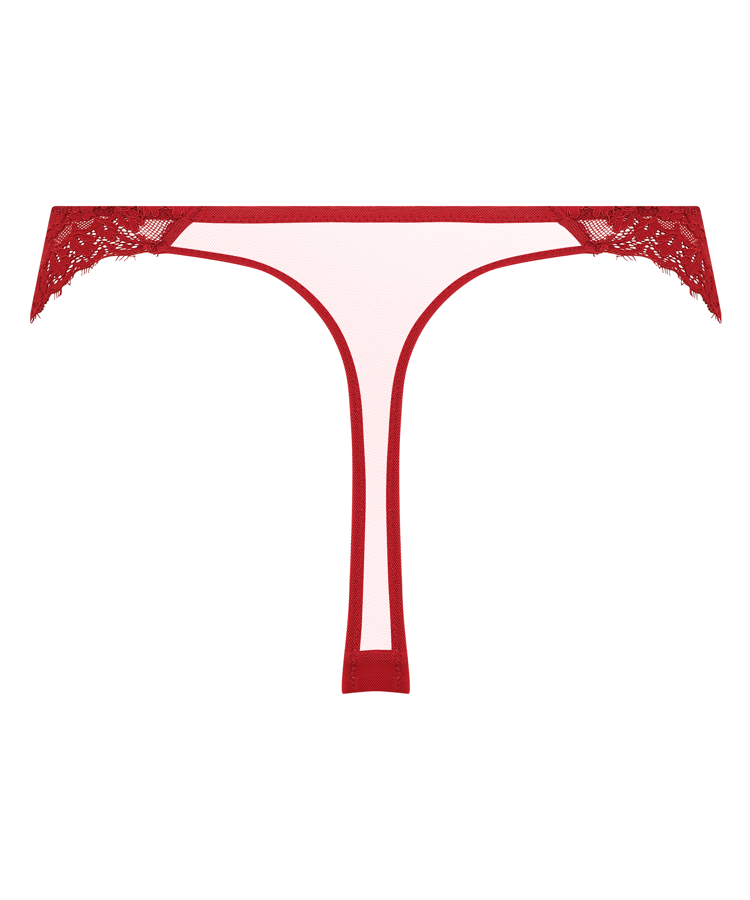 Trendy string dat is uitgevoerd met transparant kant aan de voorzijde en mesh aan de achterzijde. Aan de voorzijde zit in het midden een knoopje.