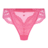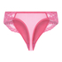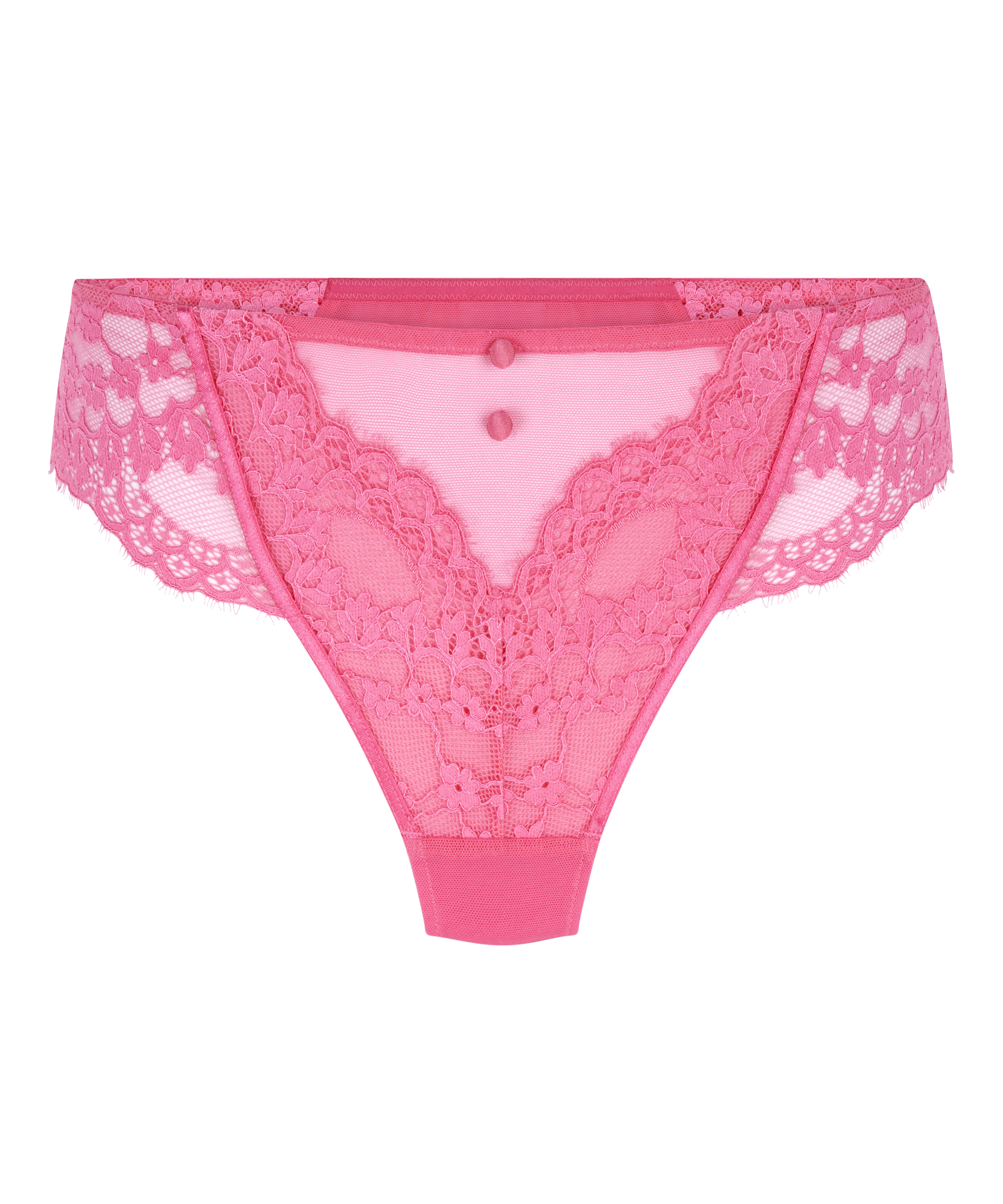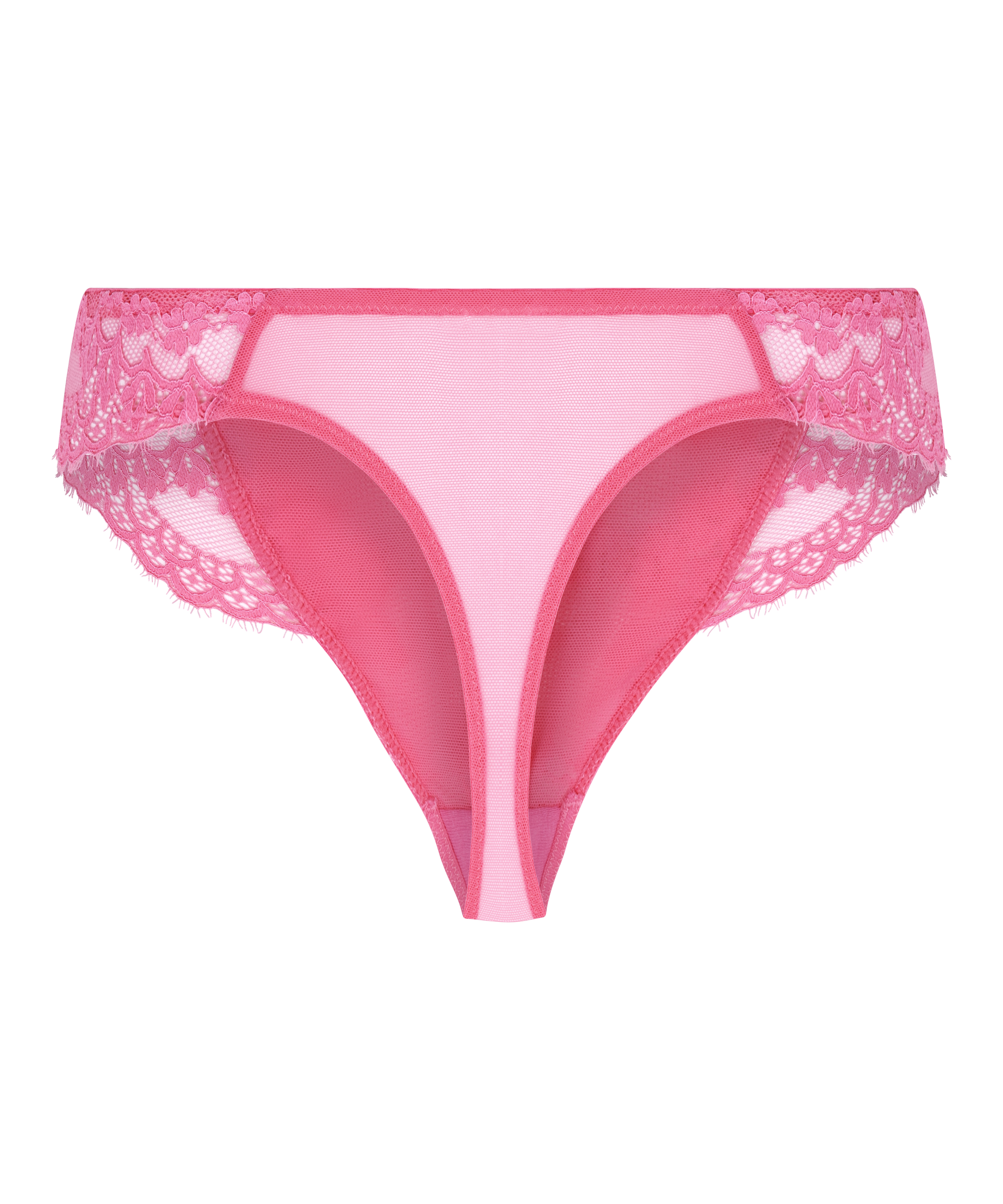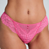 Trendy string dat is uitgevoerd met transparant kant aan de voorzijde en mesh aan de achterzijde. Aan de voorzijde zit in het midden een knoopje.