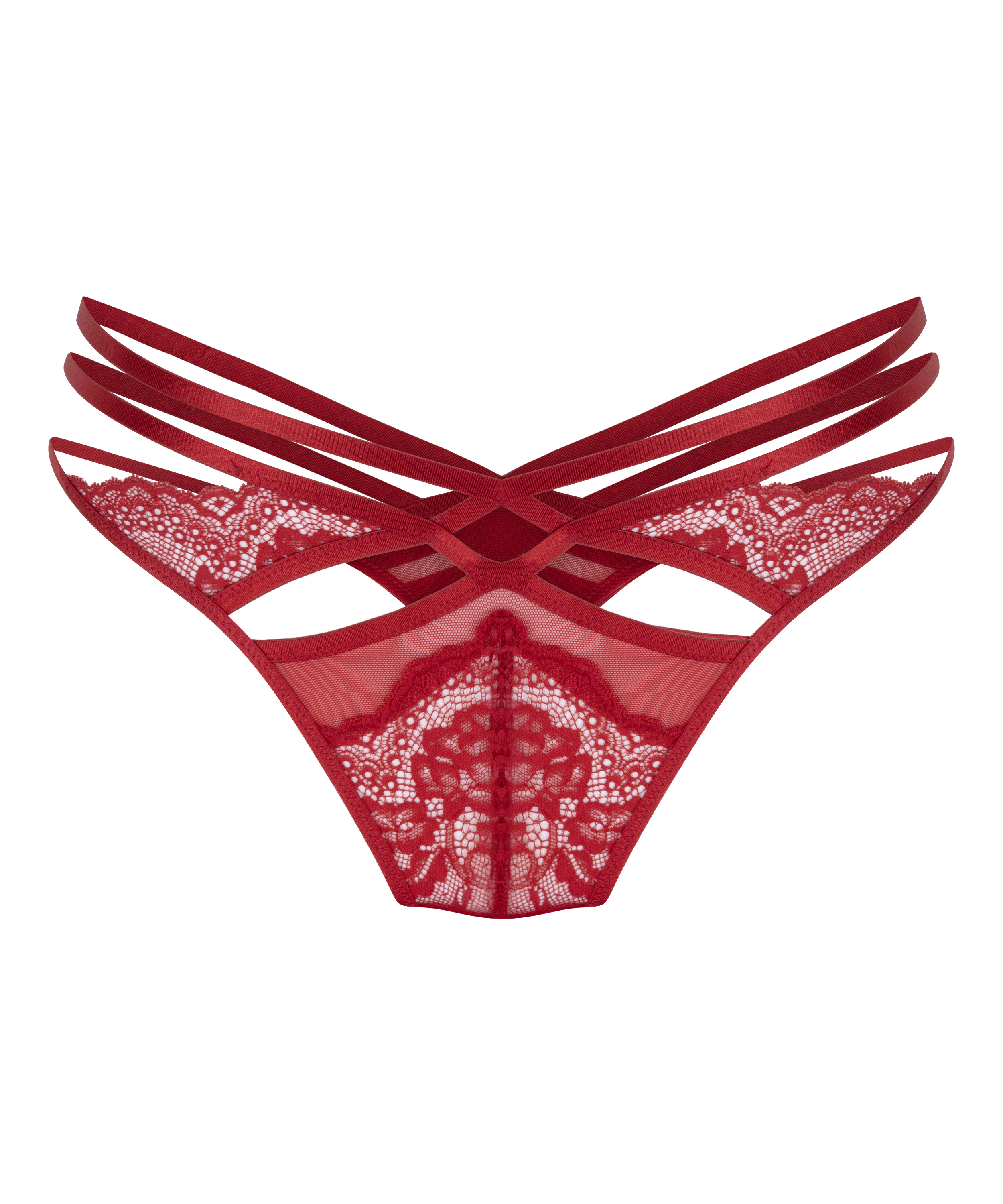Breng je lingerie naar een hoger niveau met deze prachtige string! Het heeft kanten details aan de voorkant en een sexy strappy ontwerp rondom. Combineer deze string met een van onze huidige favorieten!