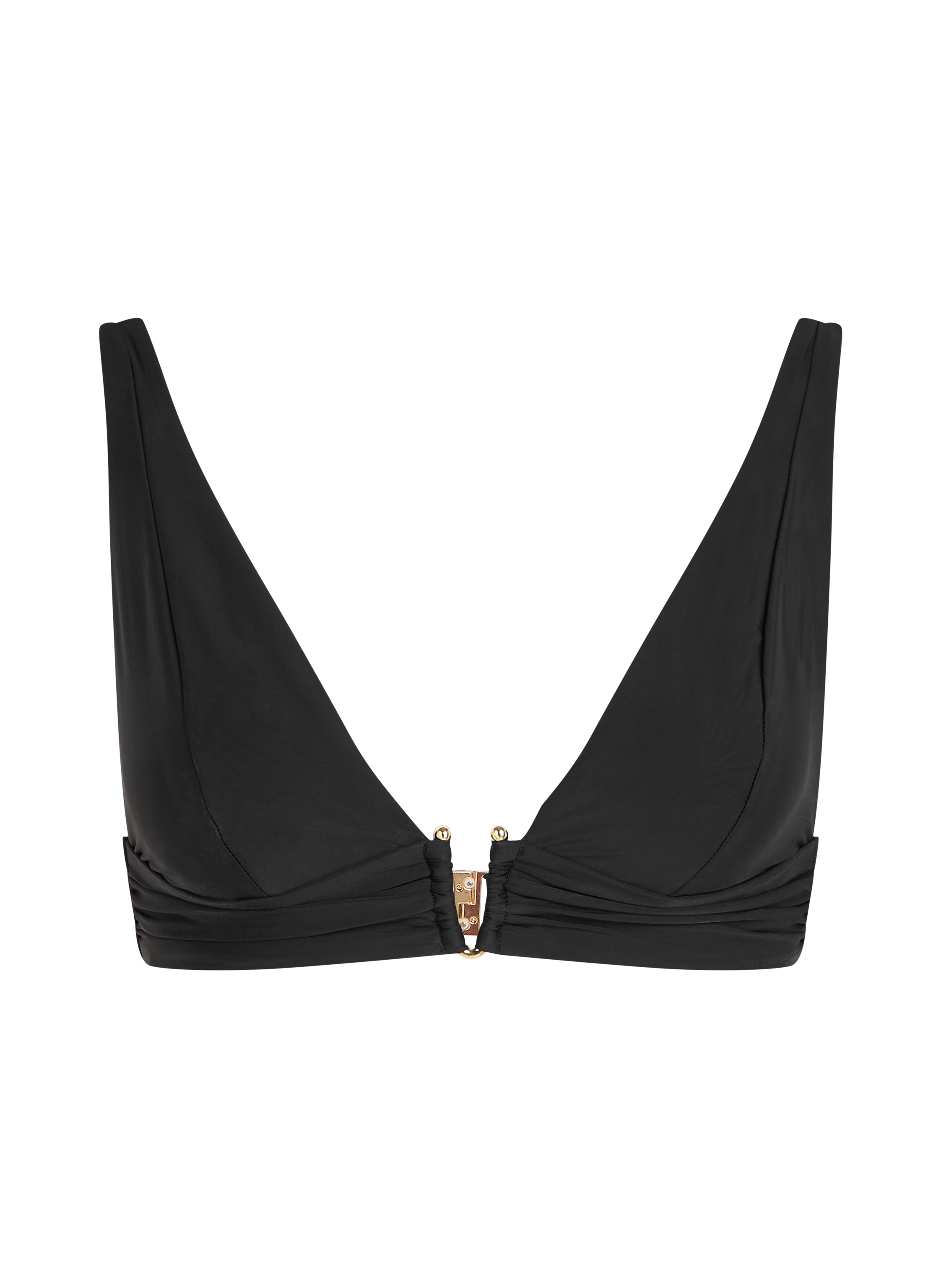 Trek de aandacht op het strand met dit bikinitopje met een V-vormig stud-detail aan de voorkant. Het topje is een natuurlijke combinatie van stijl en comfort. Of het nu voor loungen bij het zwembad is of een duik in de golven, dit is de perfecte bikinitop. Onze triangelbikinitops zijn volledig verstelbaar met een halternek en striksluiting op de rug, zodat je zelf de gewenste cupbedekking kunt bepalen. Wil je meer bedekking, kies dan een maat groter.