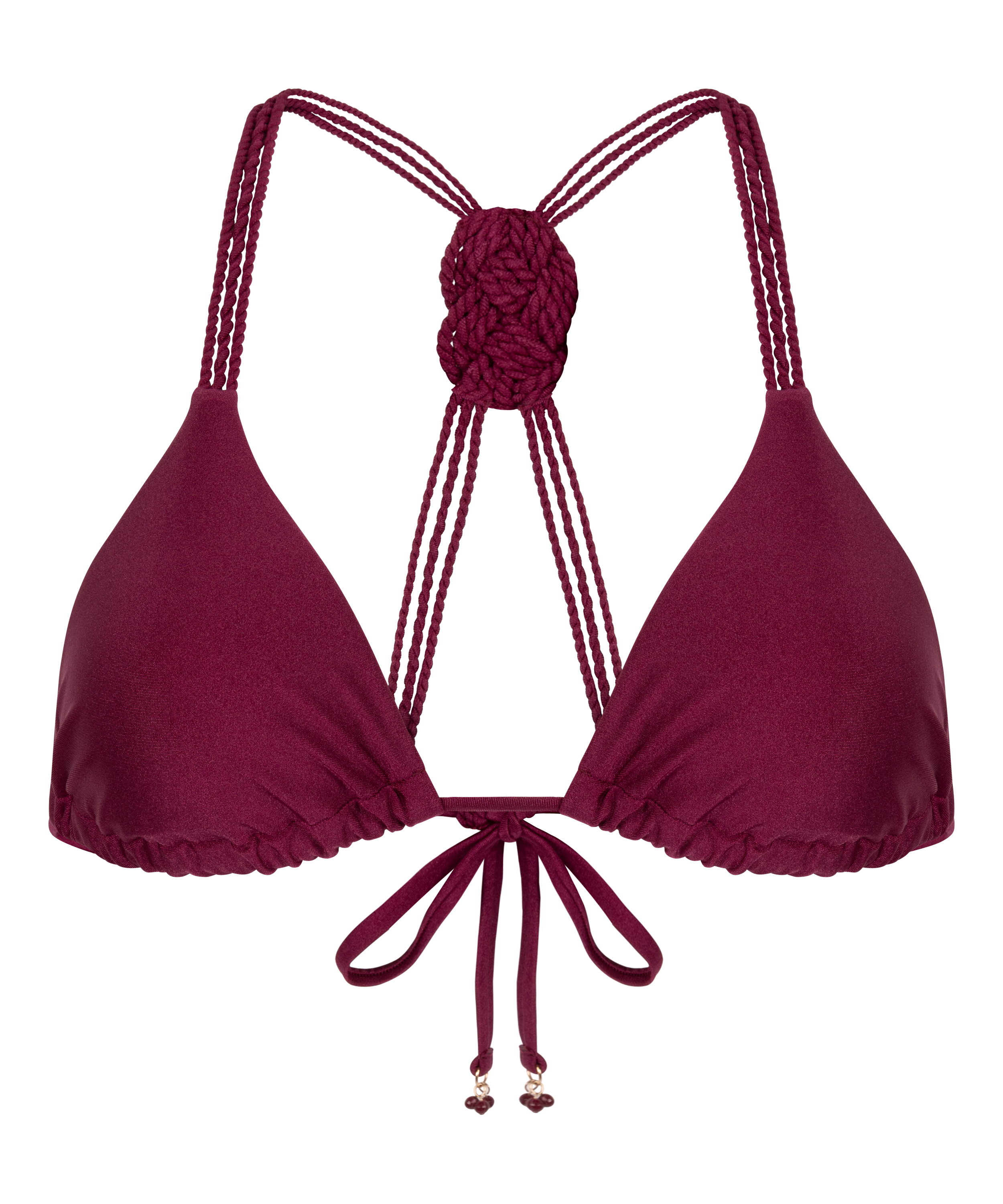 Triangel-bikinitop met uitneembare padding en drie gedraaide touwbandjes die op de rug samenkomen in een mooi knoopdesign, met klassieke bandjes op de rug afgewerkt met kleine kraaltjes. Draag het met het bijpassende broekje om de look compleet te maken. Onze triangelbikinitops zijn volledig verstelbaar met een halternek en striksluiting op de rug, zodat je zelf de gewenste cupbedekking kunt bepalen. Wil je meer bedekking, kies dan een maat groter.