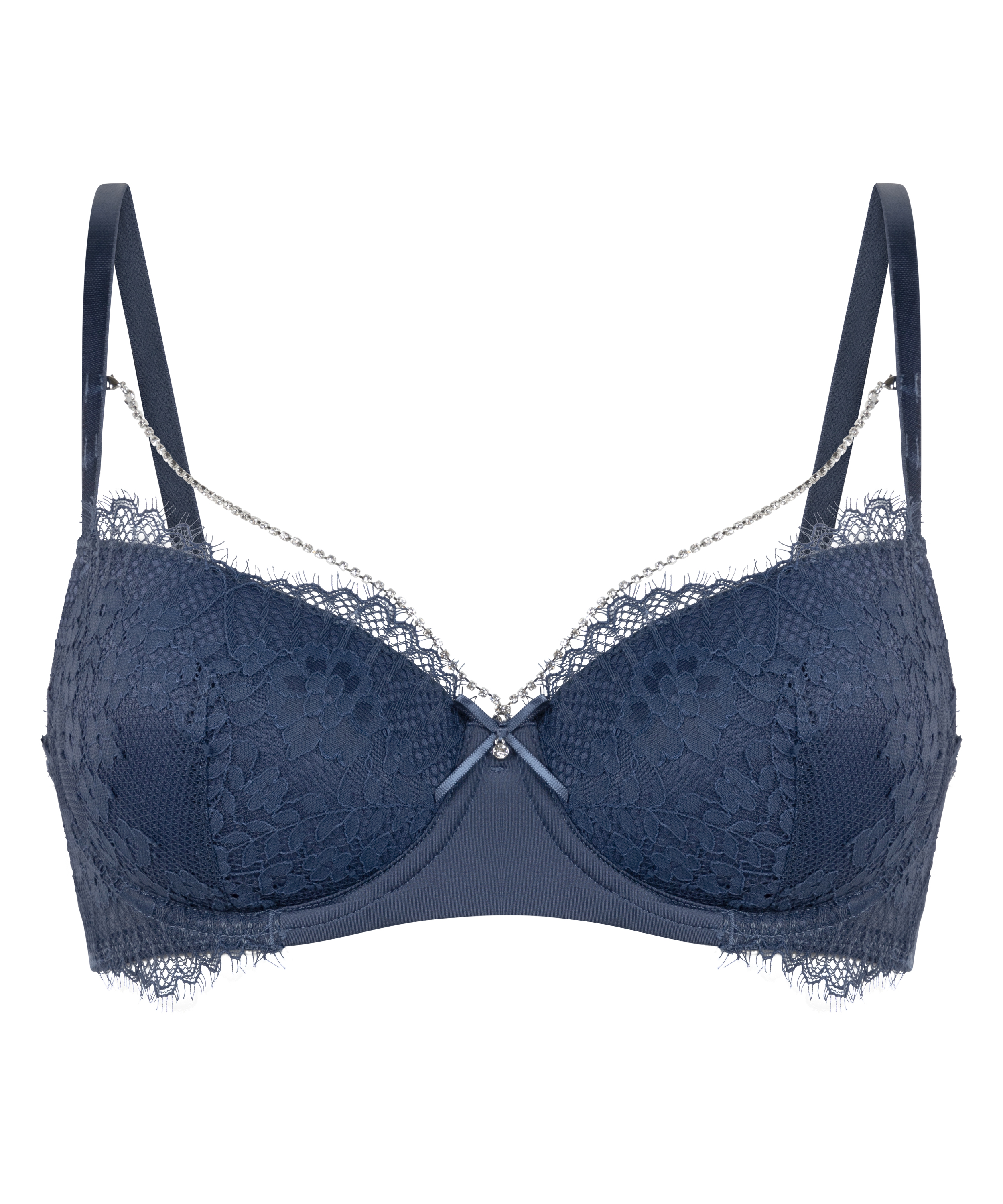 Voel je onweerstaanbaar sexy in deze voorgevormde beugel-bh! Geniet van de luxe kanten details en een schattig strikje tussen de cups. Inclusief afneembare ketting voor een speelse touch. Maak de look compleet met de bijpassende slipjes!