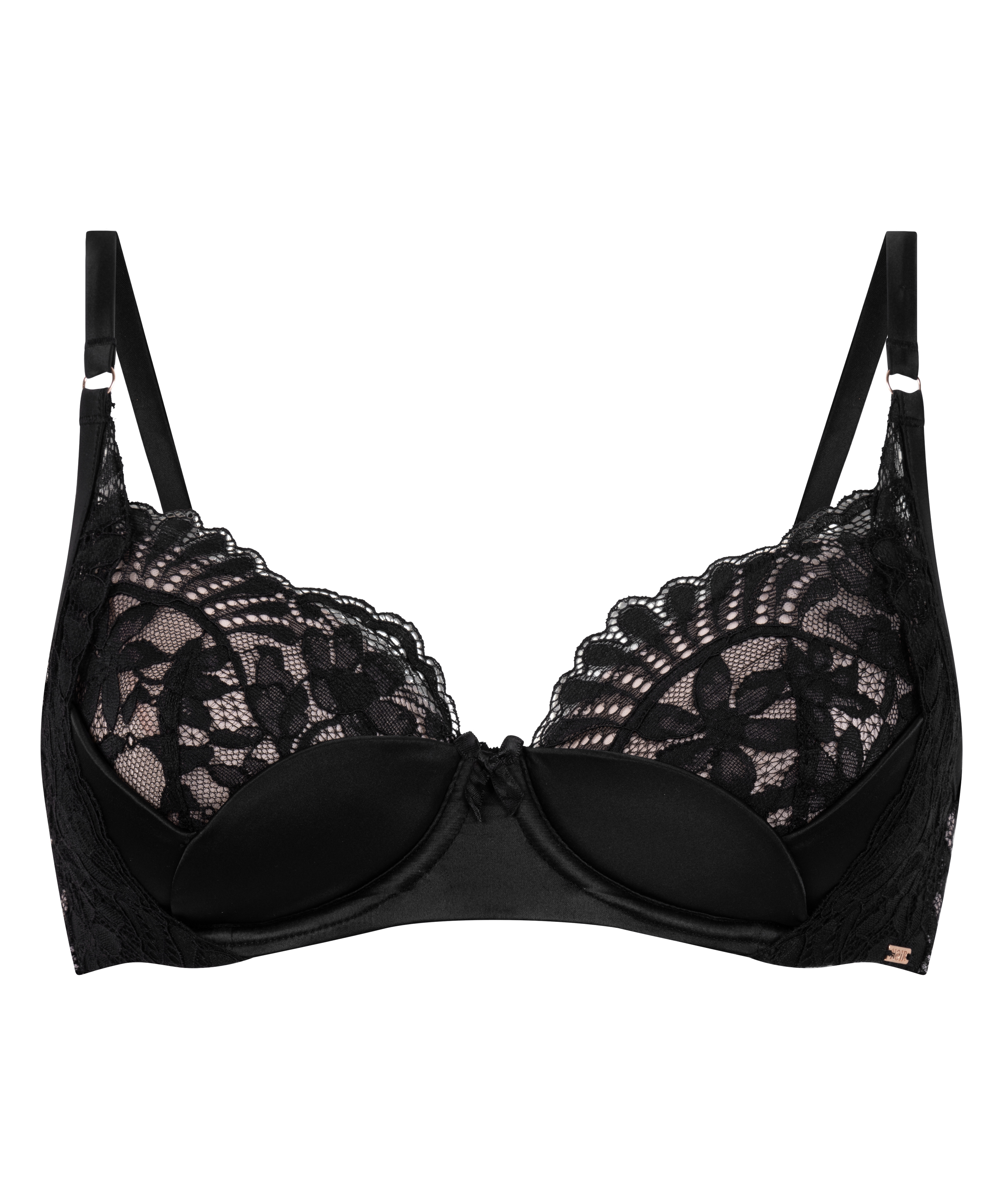 Geniet van tijdloze elegantie met deze bh. De satijnen stof voelt luxueus aan en heeft een flatterende pasvorm, terwijl de kanten accenten een romantisch tintje geven. Ontworpen met gewatteerde cups en ondersteunende beugels. Onderdeel van de Noir-collectie.