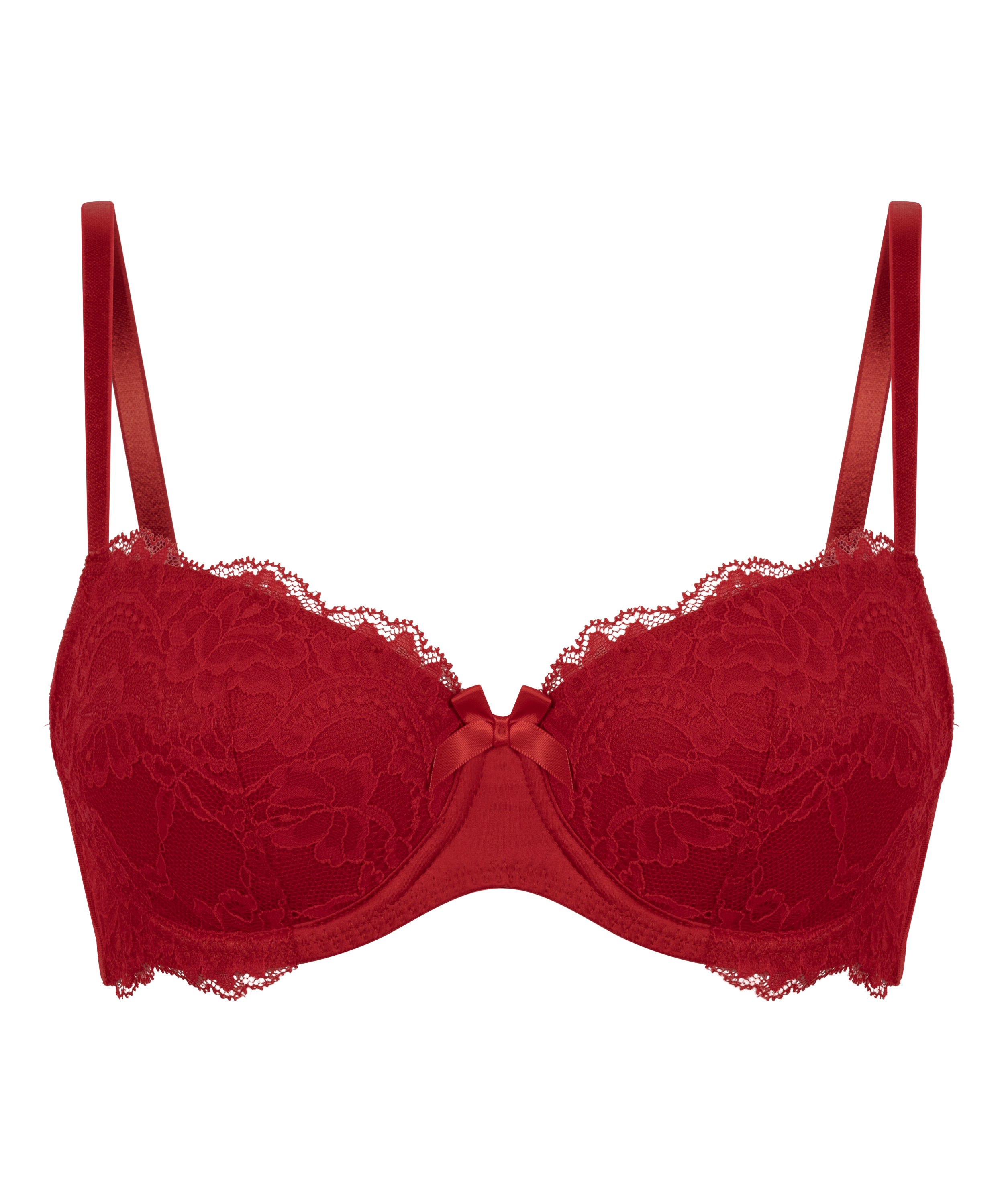 Dit is de perfecte bh voor jou! De bh heeft voorgevormde cups met beugel en de schouderbandjes kunnen naar wens worden versteld. De bh is afgewerkt met kant en heeft een strikje tussen de cups.