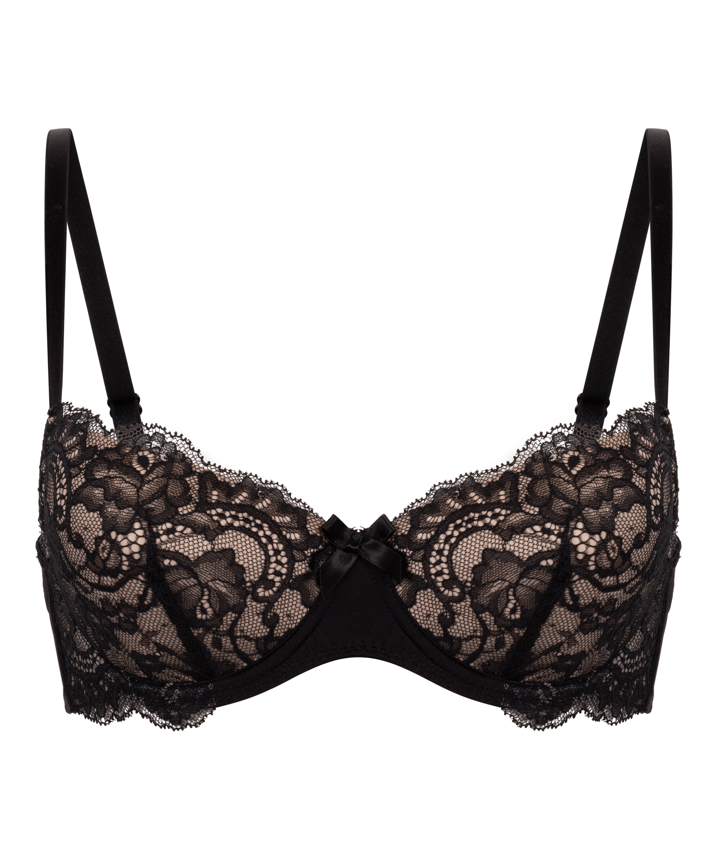 Dit is de perfecte bh voor jou! De bh heeft voorgevormde cups met beugel en de schouderbandjes kunnen naar wens worden versteld. De bh is afgewerkt met kant en heeft een strikje tussen de cups.