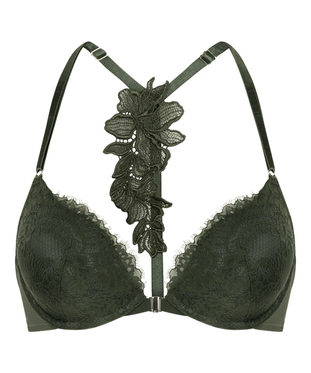 Onze push-upbh met diepe halslijn is een combinatie van stoer en mooi.De diepe halslijn accentueert je natuurlijke vormen, terwijl de voorgevormde cups en beugels je extra lift en ondersteuning geven. De metalen haaksluiting zorgt voor een moderne twist en het racerback-ontwerp is zowel functioneel als stijlvol. Combineer met het bijpassende broekje voor een complete look.